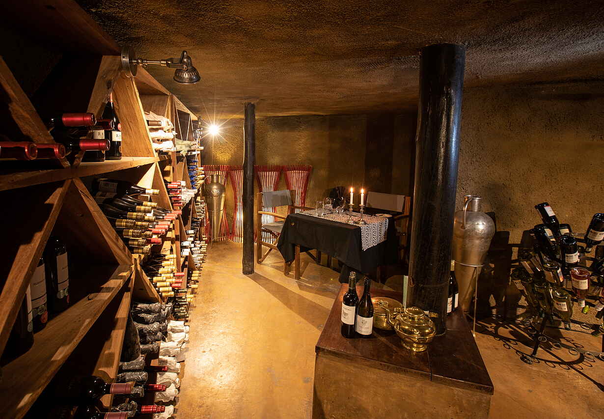 Auf der anderen Seite liegt der Speisebereich und der klimatisierte Weinkeller, der sich direkt über dem Spa befindet. Von dort betritt man durch handgeschnitzte Holztüren aus Sansibar den Souvenirshop, der lokal und regional hergestelltes Kunsthandwerk anbietet. Ein etwa 70 m langer Steg führt zur Bootsanlegestelle. Dort kommen in aller Regel die Gäste an.