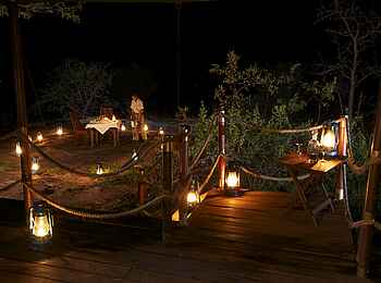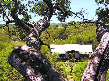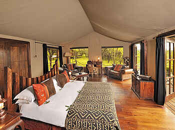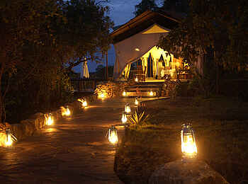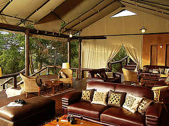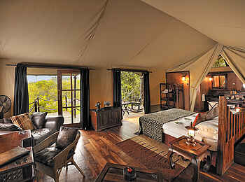 20 Zelte mit gehobener Ausstattung und luxuriöser Einrichtung, erhöht auf dem Holzplattformen gelegen. Je 2 Betten (double oder twins), Nachtkästchen mit Leselampen, Schreibtisch, Lounge-Bereich, separates Badezimmer, abgetrennt durch feste Wände und Holztüren, mit Doppelwaschbecken, Spültoilette, Dusche mit fließend Kalt- und Warmwasser, das 24 Stunden vom Solargenerator erhitzt wird. Ausstattung: Bademäntel, Hausschuhe, Fön, Moskitonetz, Ventilator, Elektronischer Safe, Interne Telefonanlage. Jedes Zelt hat eine Aussichtsterrasse, die um das Zelt herumgeht und einen Ausblick in alle 4 Himmelsrichtungen ermöglicht. Elektrizität steht rund um die Uhr zur Verfügung. Zimmer-, Butler- und Wäscheservice.