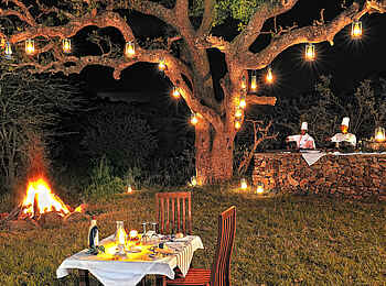 Vollpension: Frühstück, Lunch und 4-Gänge-Dinner. Getränke inkl. außer Champagner, Premiumweinen und -Spirituosen. Die Gäste speisen im Restaurant im Innen- oder Außenbereich an den privaten Tischen. Es werden romantische Private Dinners angeboten, sowie Holzkohle-Barbecues. Während der Aktivitäten Picknick-Frühstück, Sundowner oder "al fresco"-Buschmahlzeiten.