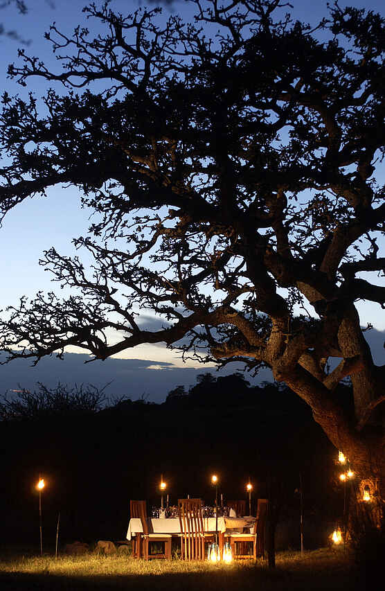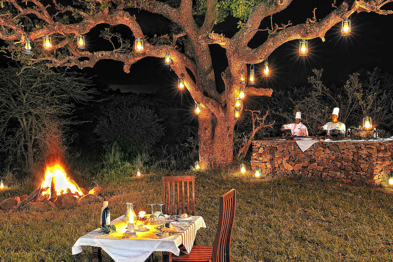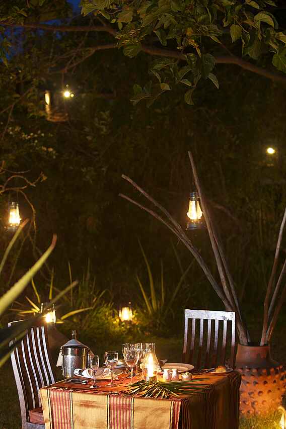 Vollpension: Frühstück, Lunch und 4-Gänge-Dinner. Getränke inkl. außer Champagner, Premiumweinen und -Spirituosen. Die Gäste speisen im Restaurant im Innen- oder Außenbereich an den privaten Tischen. Es werden romantische Private Dinners angeboten, sowie Holzkohle-Barbecues. Während der Aktivitäten Picknick-Frühstück, Sundowner oder "al fresco"-Buschmahlzeiten.