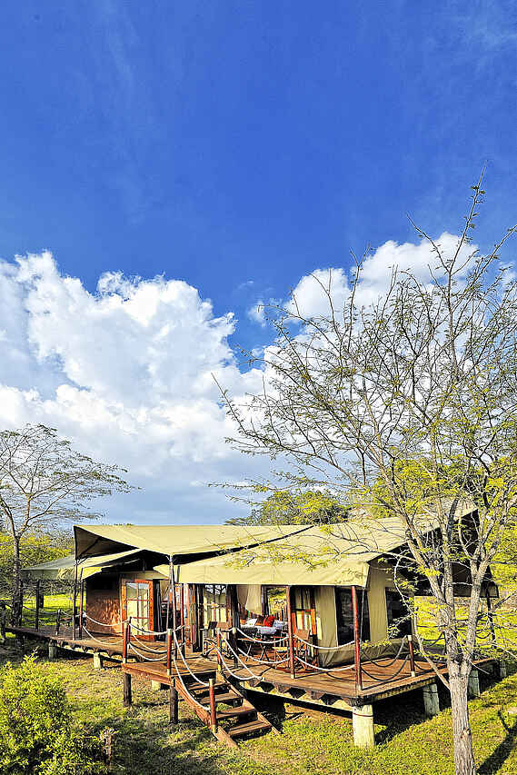 Nordwest-Tansania, Lobo-Region, im Norden des Serengeti-Nationalparks, am Fuße der Ndasiata Hills am Ufer des Grumeti. Das Camp liegt umgeben von einem kleinen Wäldchen im Grasland.