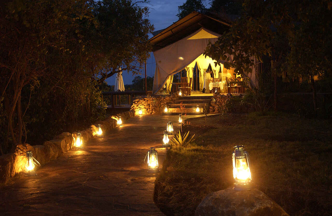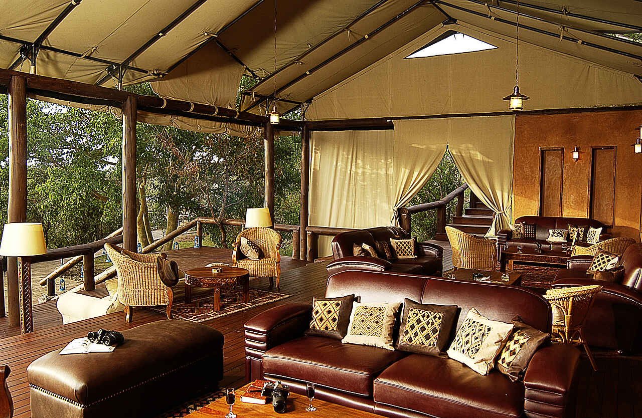 20 Zelte mit gehobener Ausstattung und luxuriöser Einrichtung, erhöht auf dem Holzplattformen gelegen. Je 2 Betten (double oder twins), Nachtkästchen mit Leselampen, Schreibtisch, Lounge-Bereich, separates Badezimmer, abgetrennt durch feste Wände und Holztüren, mit Doppelwaschbecken, Spültoilette, Dusche mit fließend Kalt- und Warmwasser, das 24 Stunden vom Solargenerator erhitzt wird. Ausstattung: Bademäntel, Hausschuhe, Fön, Moskitonetz, Ventilator, Elektronischer Safe, Interne Telefonanlage. Jedes Zelt hat eine Aussichtsterrasse, die um das Zelt herumgeht und einen Ausblick in alle 4 Himmelsrichtungen ermöglicht. Elektrizität steht rund um die Uhr zur Verfügung. Zimmer-, Butler- und Wäscheservice.