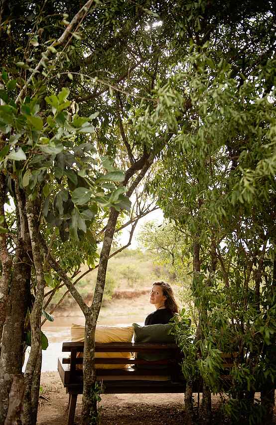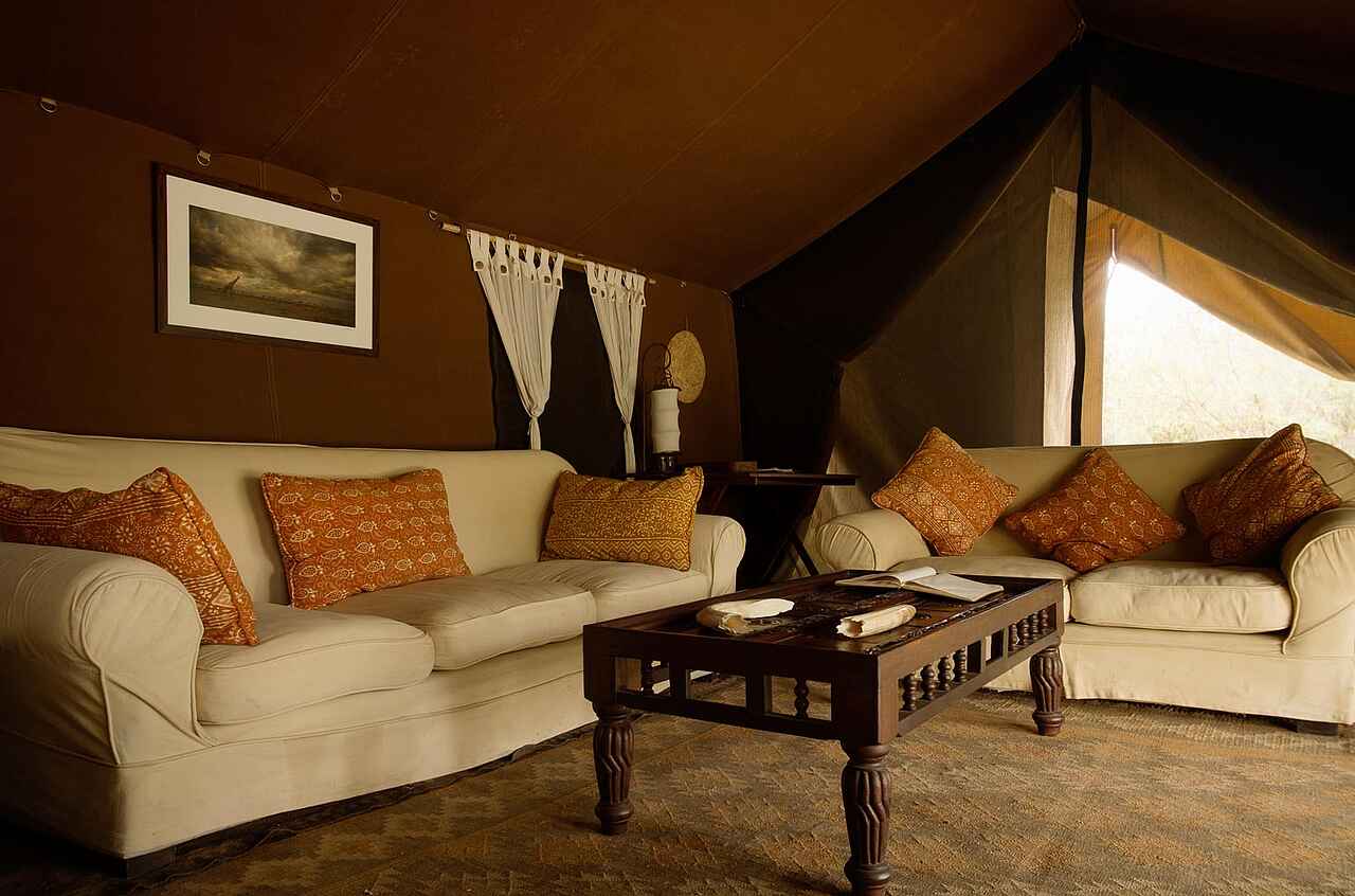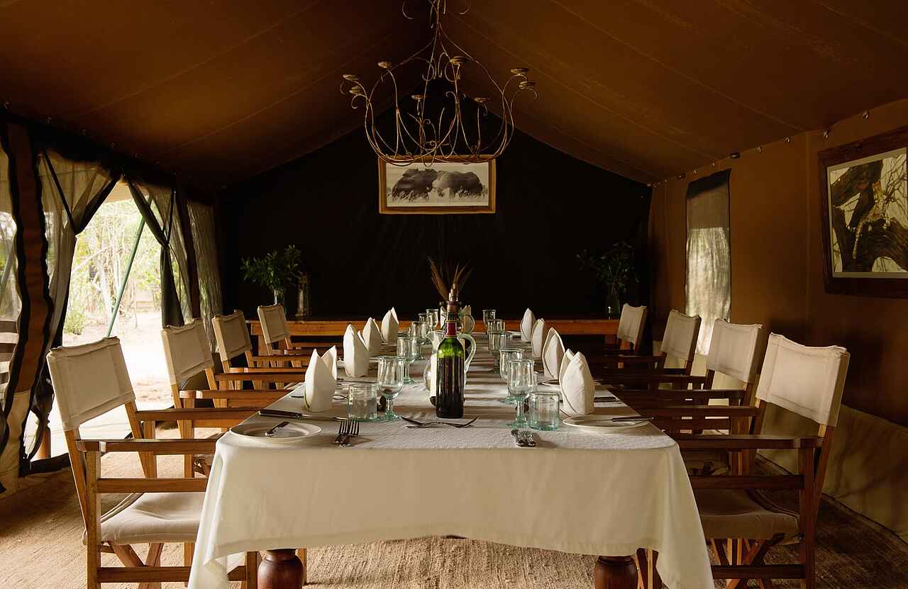 Der zentrale Bereich des Serian’s Nkorombo Mobile Camps bildet das Herz des Safaricamps und dient als entspannter Treffpunkt vor und nach den Pirschfahrten. Eine offen gestaltete Lounge mit bequemen Sitzmöbeln, Teppichen und ausgewählten Details schafft eine angenehme Atmosphäre und öffnet den Blick in die weite Savannenlandschaft. Die Mahlzeiten werden im angrenzenden Essbereich eingenommen und in den Tagesablauf integriert. Am Abend versammelt man sich häufig am Lagerfeuer, das zum natürlichen Mittelpunkt des Camps wird und den Tag in ruhiger Stimmung ausklingen lässt.