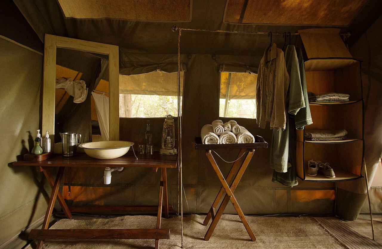 Die Gästeunterkünfte des Camps bestehen aus fünf klassisch gestalteten Safarizelten, die Funktionalität und Komfort in den Vordergrund stellen. Die Zelte sind mit bequemen Betten inklusive Moskitonetzen, Sitzgelegenheiten und ausreichend Stauraum ausgestattet. Natürliche Materialien und zurückhaltende Farben betonen den ursprünglichen Safari-Charakter des Camps. Vor jedem Zelt liegt eine private Terrasse, die sich ideal für ruhige Pausen zwischen den Aktivitäten eignet. Die En-suite-Badezimmer sind direkt angeschlossen und verfügen über Waschbecken, Toilette sowie eine traditionelle Eimerdusche. Handtücher und grundlegende Pflegeprodukte stehen zur Verfügung.