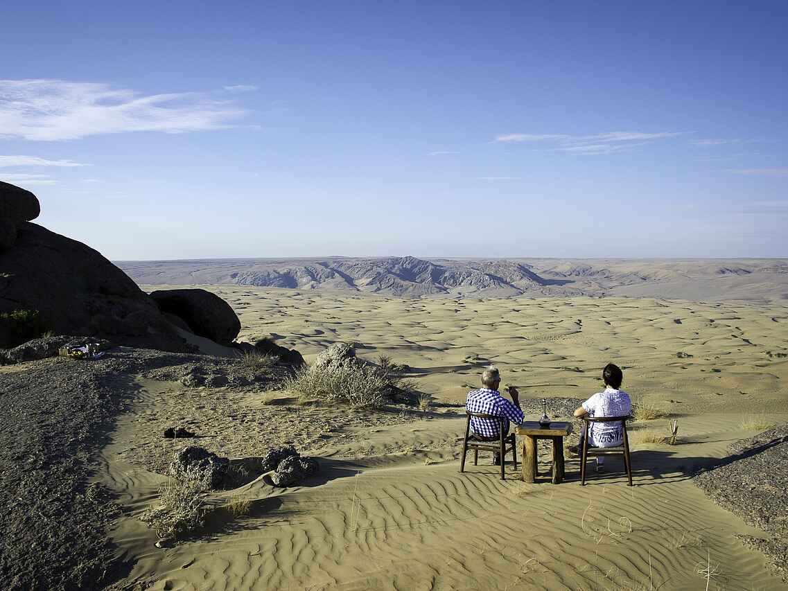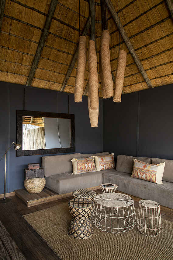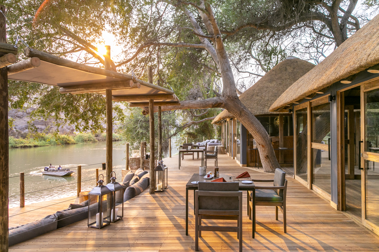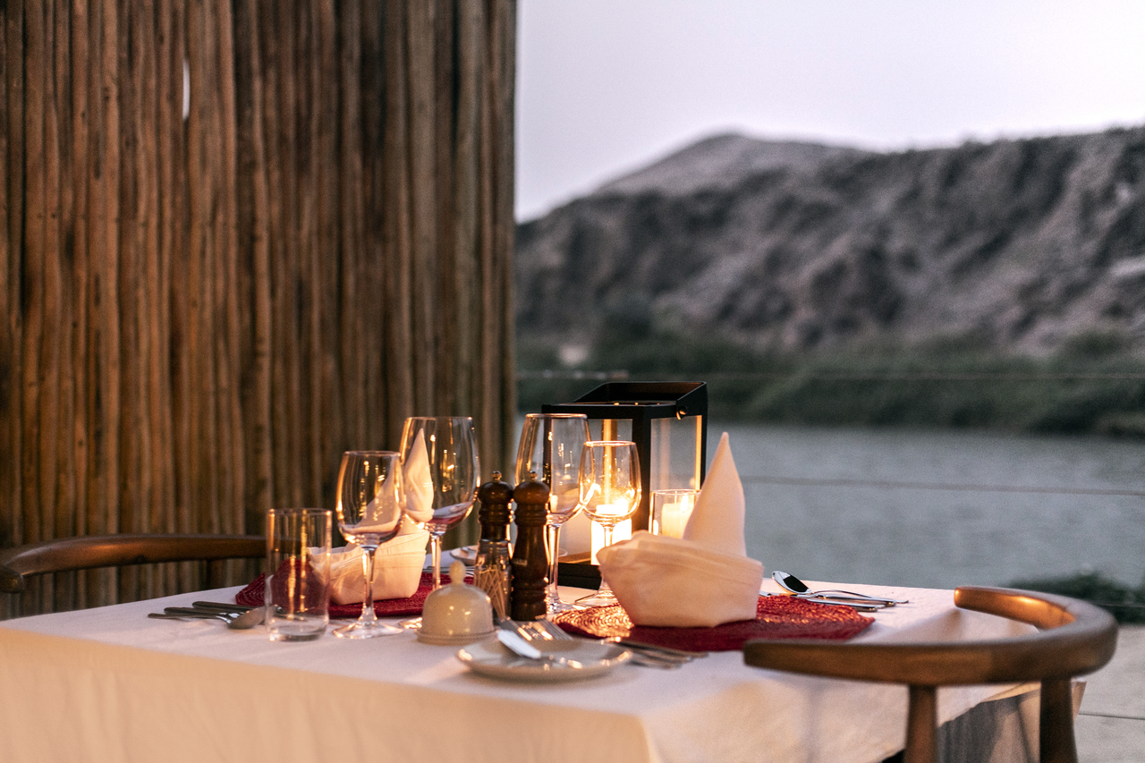 Der zentrale Bereich der Serra Cafema Lodge ist offen und großzügig gestaltet. Bequeme Sessel, eine gut ausgestattete Bar, eine kleine Bibliothek sowie der Essbereich sind so angeordnet, dass sie die Ausblicke auf den Kunene Fluss und die umliegende Landschaft aufnehmen. Ein kleiner Pool mit Liegen und Sonnenschirmen bietet zwischen den Aktivitäten Raum zum Entspannen. Auf dem Gelände stehen mehrere ausgewählte Orte für Mahlzeiten im Freien zur Verfügung, darunter auch Dinner unter dem Sternenhimmel. Die Atmosphäre ist entspannt und ungezwungen, der Service aufmerksam. Trotz der großen Abgeschiedenheit wird Wert auf regionale Produkte gelegt, die in die Gestaltung und Nutzung der Lodge einfließen und den Charakter des Ortes unterstreichen.