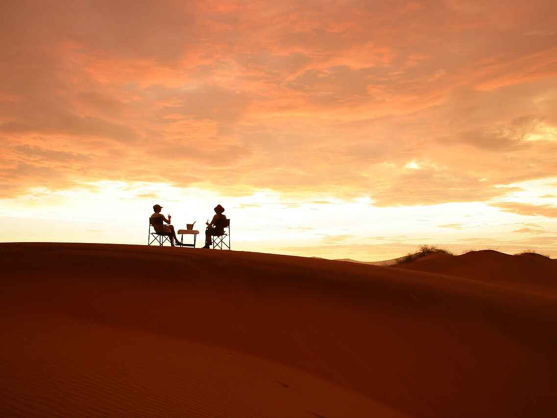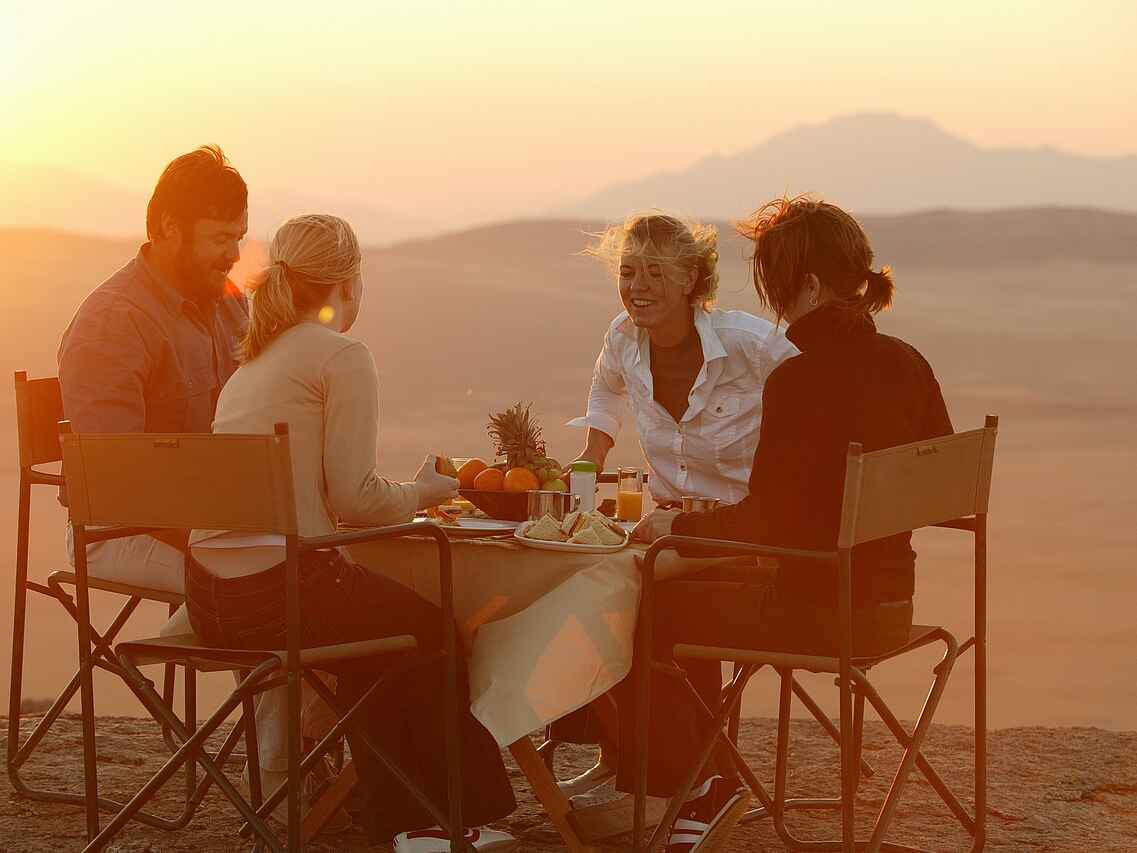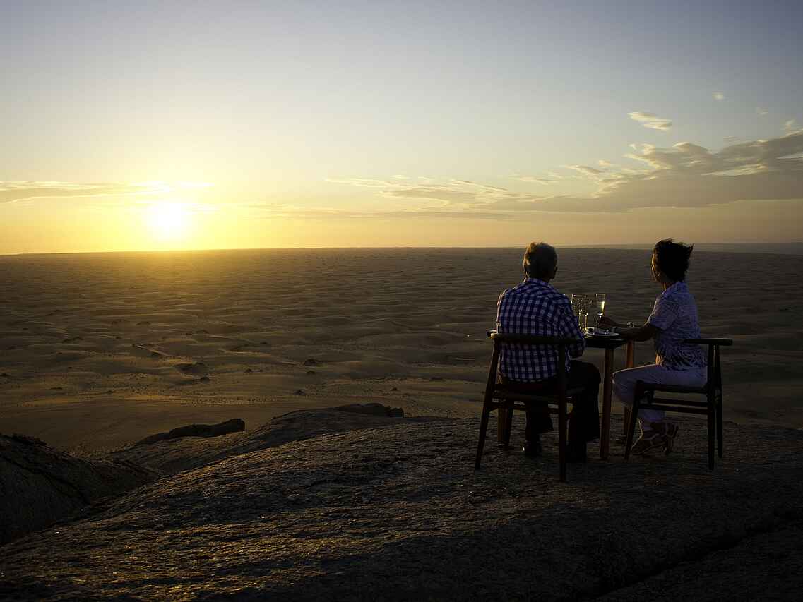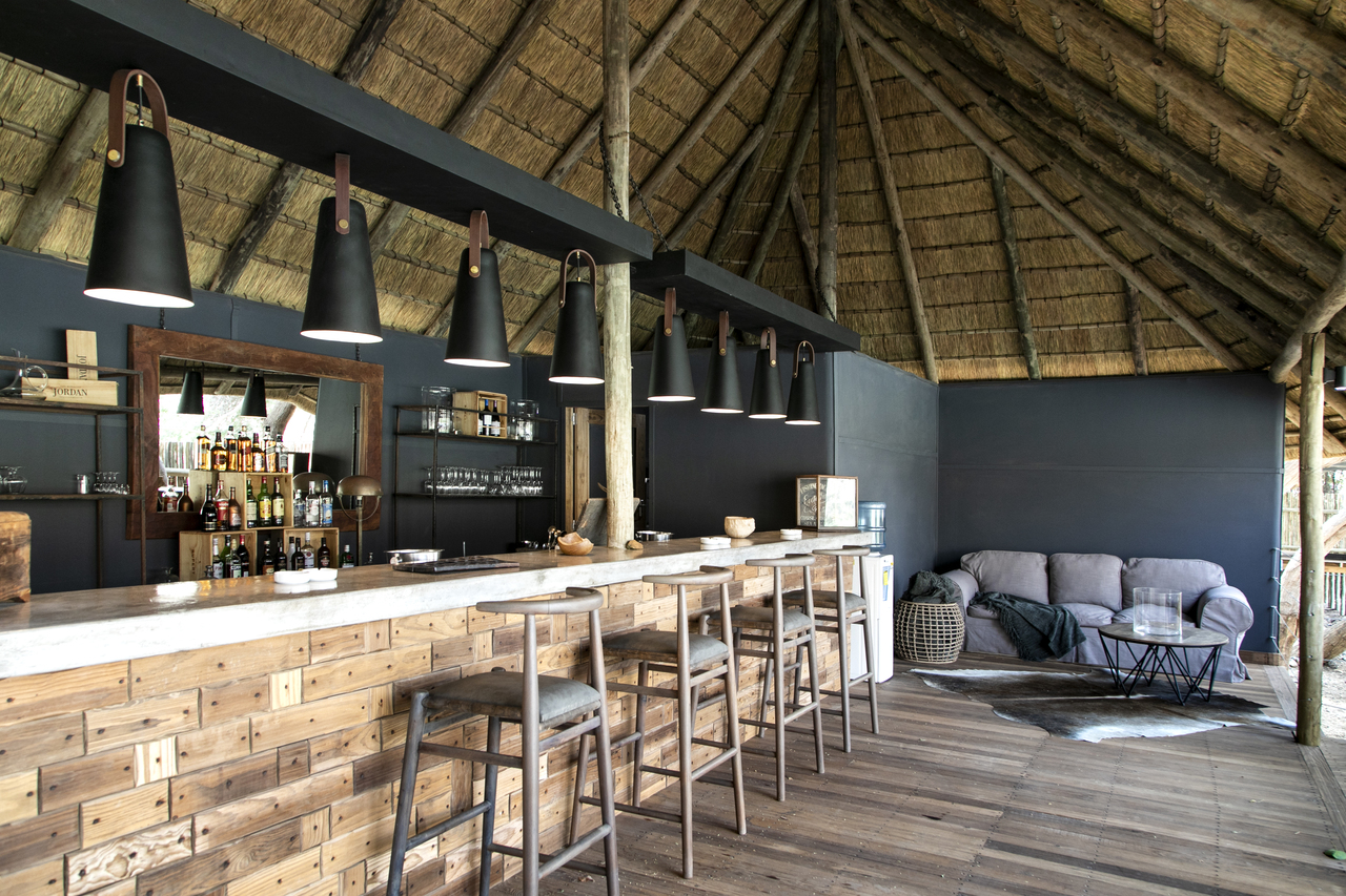 Der zentrale Bereich der Serra Cafema Lodge ist offen und großzügig gestaltet. Bequeme Sessel, eine gut ausgestattete Bar, eine kleine Bibliothek sowie der Essbereich sind so angeordnet, dass sie die Ausblicke auf den Kunene Fluss und die umliegende Landschaft aufnehmen. Ein kleiner Pool mit Liegen und Sonnenschirmen bietet zwischen den Aktivitäten Raum zum Entspannen. Auf dem Gelände stehen mehrere ausgewählte Orte für Mahlzeiten im Freien zur Verfügung, darunter auch Dinner unter dem Sternenhimmel. Die Atmosphäre ist entspannt und ungezwungen, der Service aufmerksam. Trotz der großen Abgeschiedenheit wird Wert auf regionale Produkte gelegt, die in die Gestaltung und Nutzung der Lodge einfließen und den Charakter des Ortes unterstreichen.