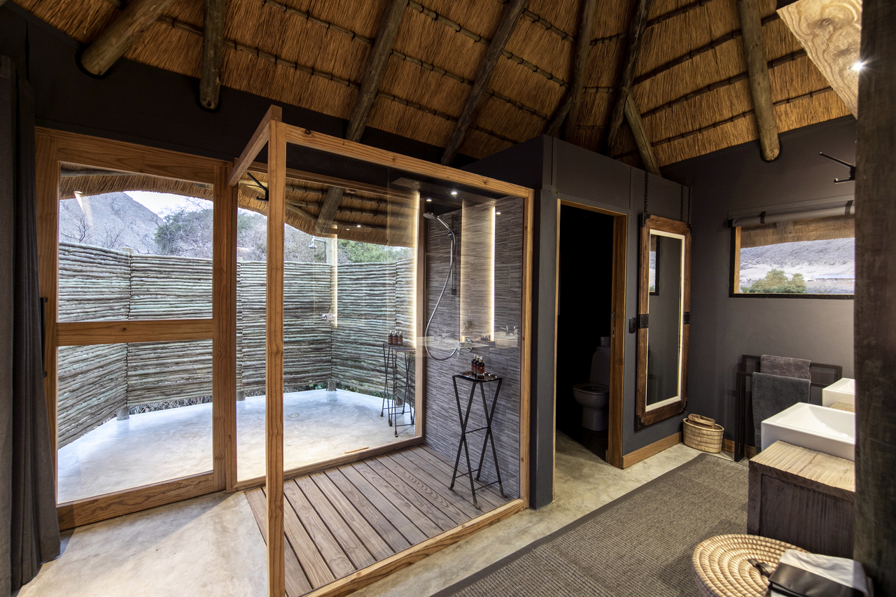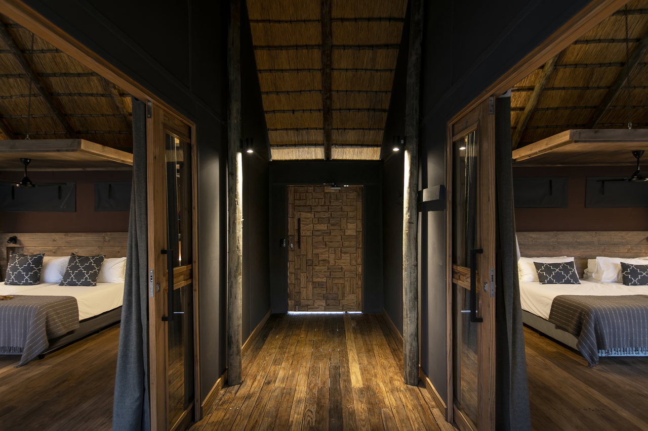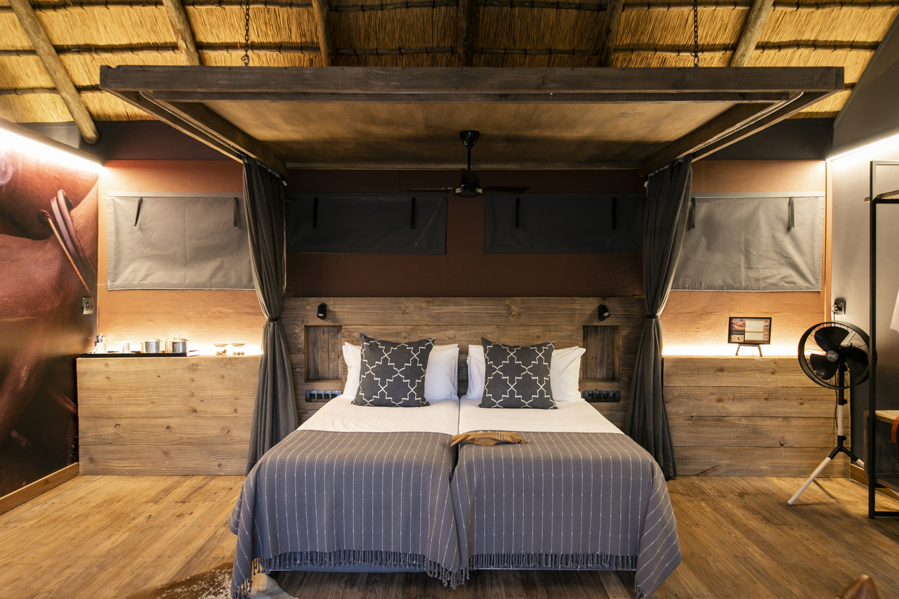 Die acht Zeltsuiten aus Canvas und Reet sind großzügig gestaltet und bieten viel Privatsphäre. Jede Einheit verfügt über einen separaten Wohnbereich sowie große Fensterfronten, die sich vollständig öffnen lassen und für angenehme Luftzirkulation sorgen. Die Betten sind mit Moskitonetzen ausgestattet und mit hochwertigen Baumwolltextilien bezogen. Das En-suite-Badezimmer bietet Doppelwaschbecken sowie eine Innen- und eine Außendusche. Handtücher und Pflegeprodukte stehen bereit. Die Gestaltung ist erdig und klar gehalten, mit neutralen Farben und ausgewählten lokalen Handwerksarbeiten. Eine großzügige Terrasse mit Sonnenliegen erweitert den Wohnraum nach außen. Alle Zeltsuiten blicken auf den Kunene Fluss, der als zentrale Lebensader der Region gilt.