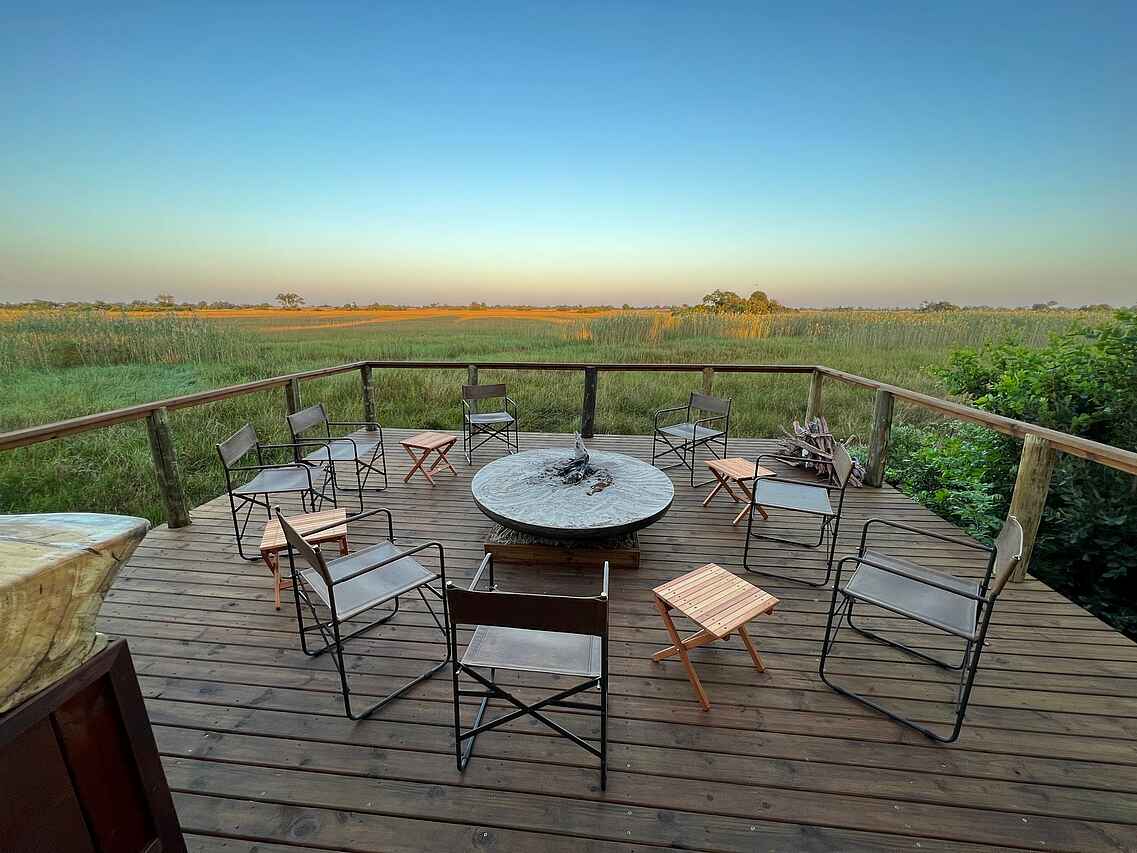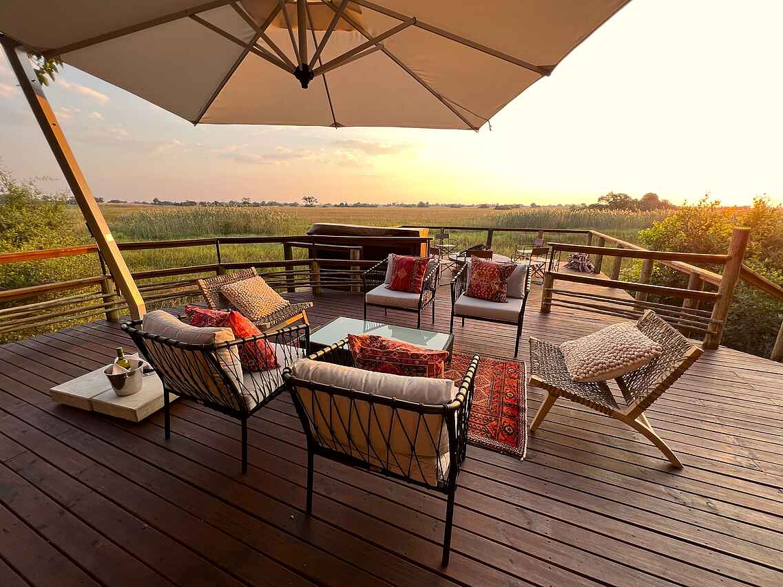Der gemeinschaftliche Bereich der Setari Treehouse Lodge umfasst einen gemütlichen Speise- und Sitzbereich, der auf eine großzügige Holzterrasse hinausgeht und einen atemberaubenden Blick auf das Okavangodelta bietet. Hier können Gäste im Freien speisen und die malerische Umgebung genießen. Eine speziell gestaltete Feuerstelle mit Sandgrube lädt nach dem Abendessen zum Verweilen ein und ein kleiner Swimmingpool mit Liegestühlen sorgt für Abkühlung an heißen Oktobernachmittagen. WLAN steht im gesamten Bereich zur Verfügung und ein Wäscheservice ist im Preis inbegriffen.