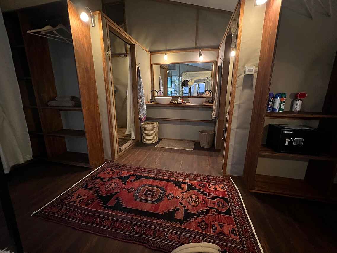 Die drei Baumhaus-Suiten sind luxuriös eingerichtet und bieten modernen Komfort inmitten der Natur. Jede Suite verfügt über ein großes Doppelbett mit Moskitonetz, einen Ventilator, einen Schreibtisch, gemütliche Sessel und eine private Terrasse mit Sitzgelegenheiten. Die eleganten En-suite-Badezimmer bieten ständiges Warmwasser, eine Dusche, ein WC, Doppelwaschbecken, hochwertige Handtücher und einen Haartrockner.