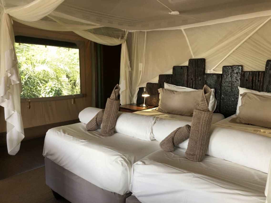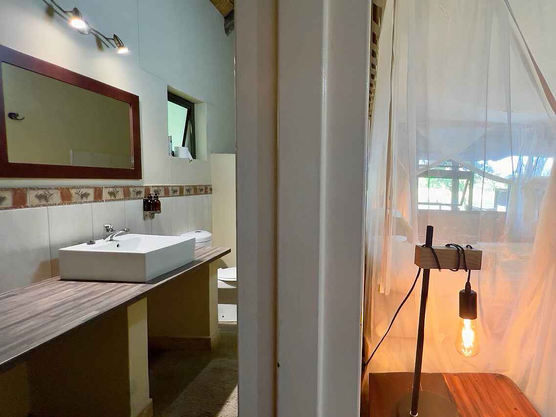 Die Chalets mit Veranda sind einfach, aber geschmackvoll eingerichtet. Manche bieten Aussicht auf den Fluss. Alle Chalets verfügen über komfortable Betten mit Moskitonetzen, Klimaanlage, eine Minibar sowie Kaffee- und Teezubereitungsmöglichkeiten. Die En-suite-Badezimmer sind modern ausgestattet mit Doppelwaschbecken, Indoor- und Outdoorduschen sowie hochwertigen Pflegeprodukten.