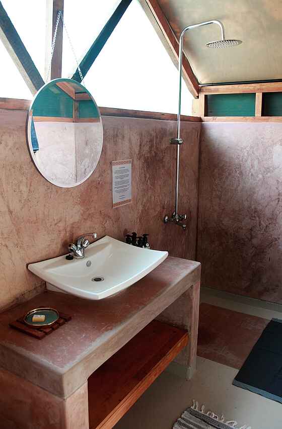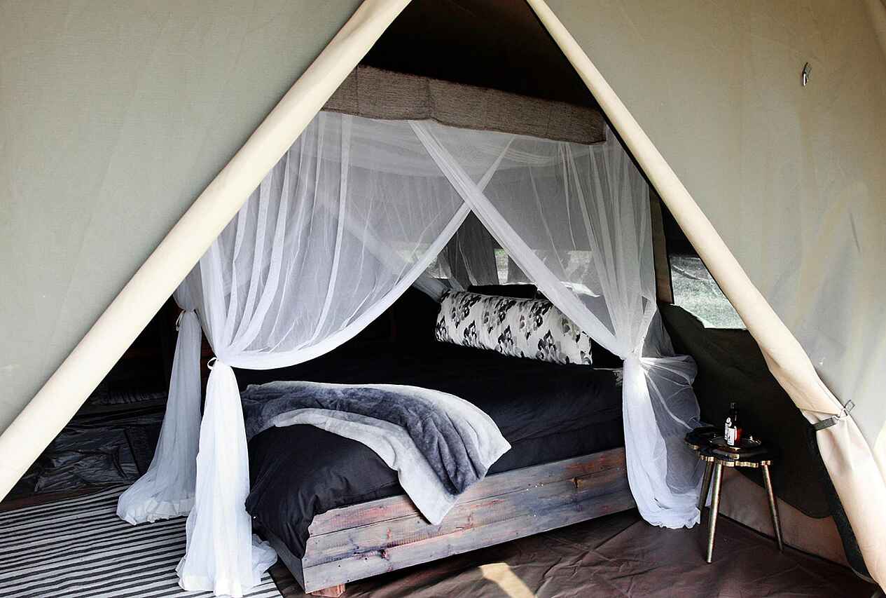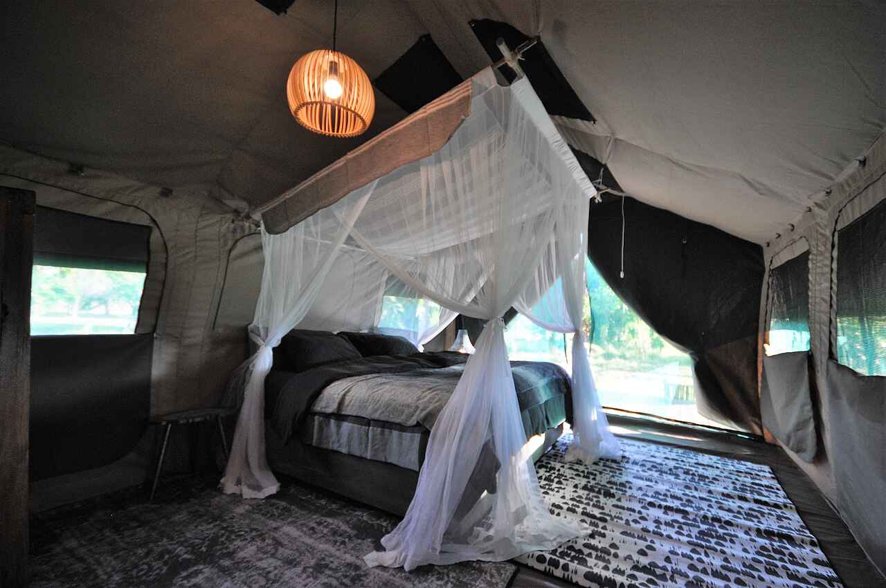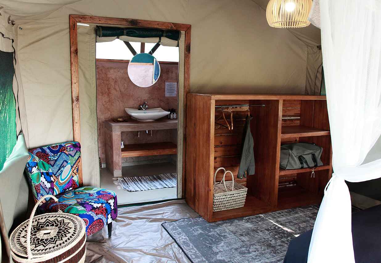 Die Zelte sind einfach, wettergeschützt und zweckmäßig eingerichtet. Innen warten bequeme Betten mit Moskitonetzen, ein kleiner Ablagebereich sowie Platz für Gepäck. Jedes Zelt verfügt über ein En-suite-Badezimmer mit Waschbecken, Toilette und Dusche, Warmwasser wird nach Bedarf bereitgestellt. Die Ausstattung ist funktional und auf das Wesentliche reduziert, wodurch sich der Fokus klar auf die Naturerfahrung legt.