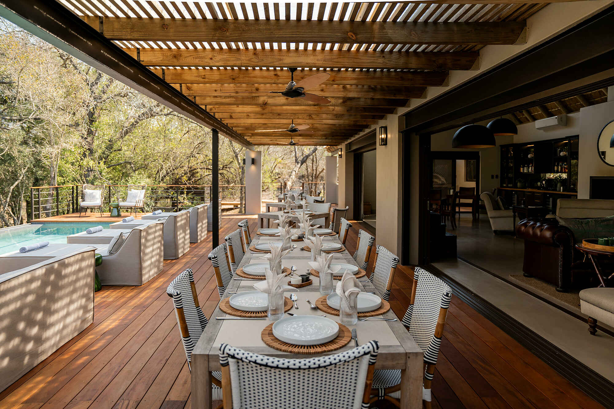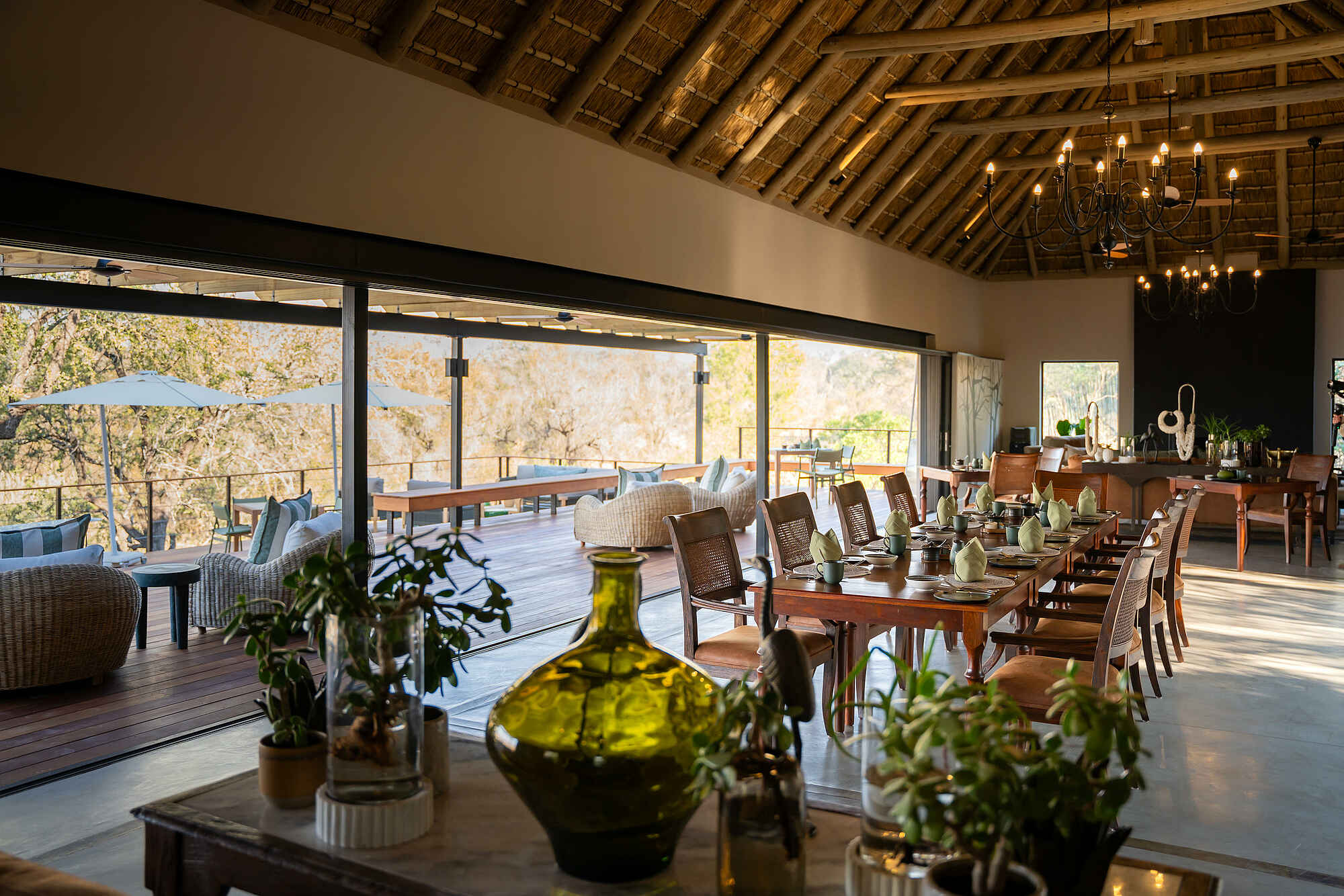 Das Herz der Lodge bildet eine offene Lounge mit weichen Sitzmöbeln, natürlichen Materialien und warmen Erdtönen. Große Fensterfronten holen das Licht und die Landschaft nach innen und lassen den Blick weit über den Busch schweifen. Draußen lädt der Poolbereich mit Liegen und Ausblick ins Grüne zum Abschalten zwischen den Aktivitäten ein. Abends trifft man sich am knisternden Feuer der Boma oder genießt ein Dinner unter dem Sternenhimmel. Wer sich etwas Gutes gönnen möchte, bucht eine Massage im kleinen Spa oder nutzt den Fitnessraum, bevor man in der kleinen Bibliothek in Ruhe schmökert. Alles wirkt stimmig, natürlich und wohltuend unaufgeregt.