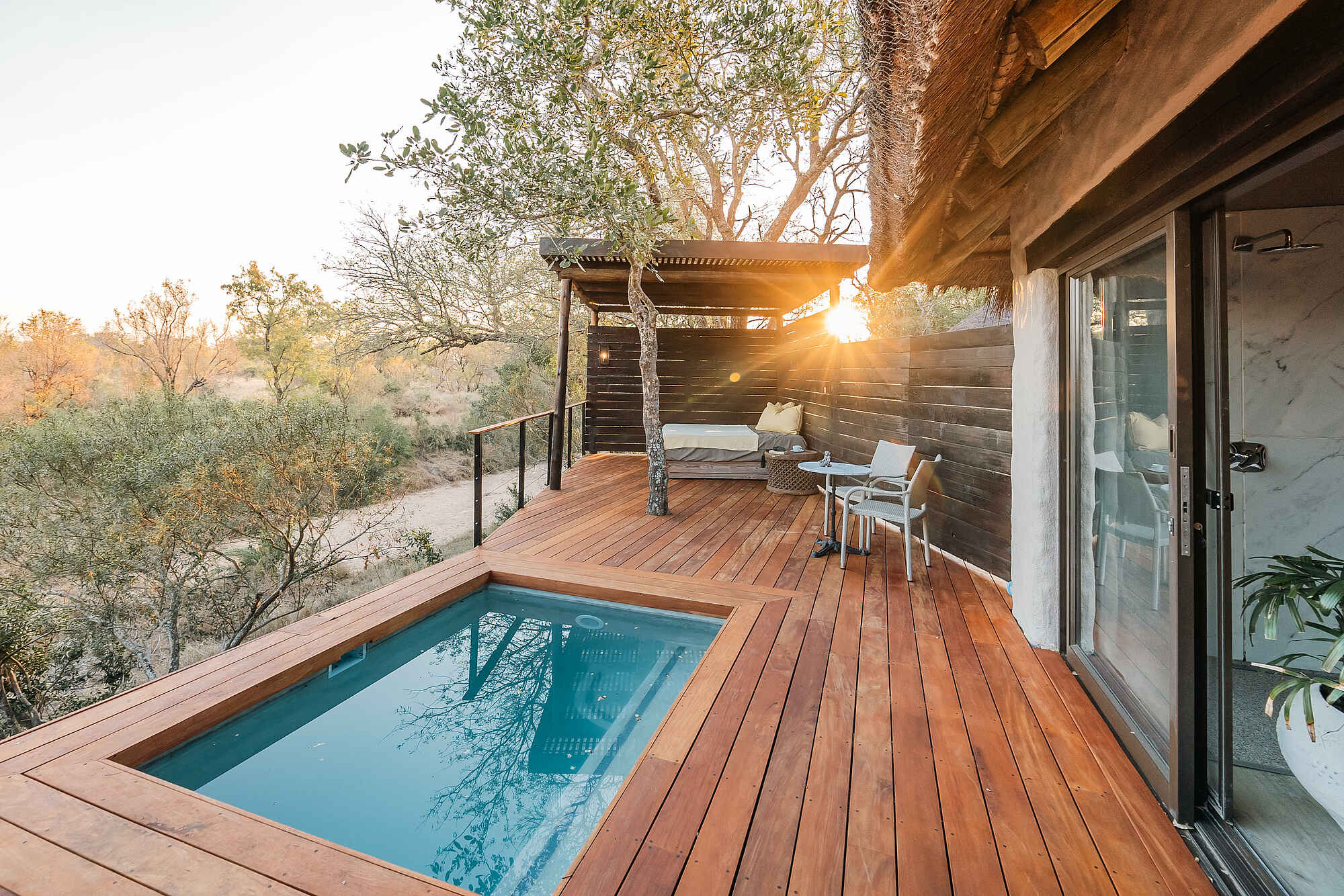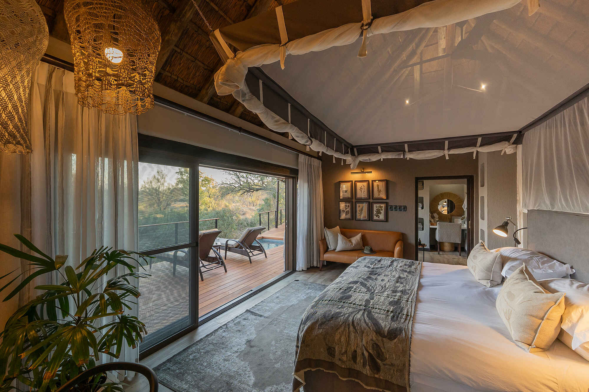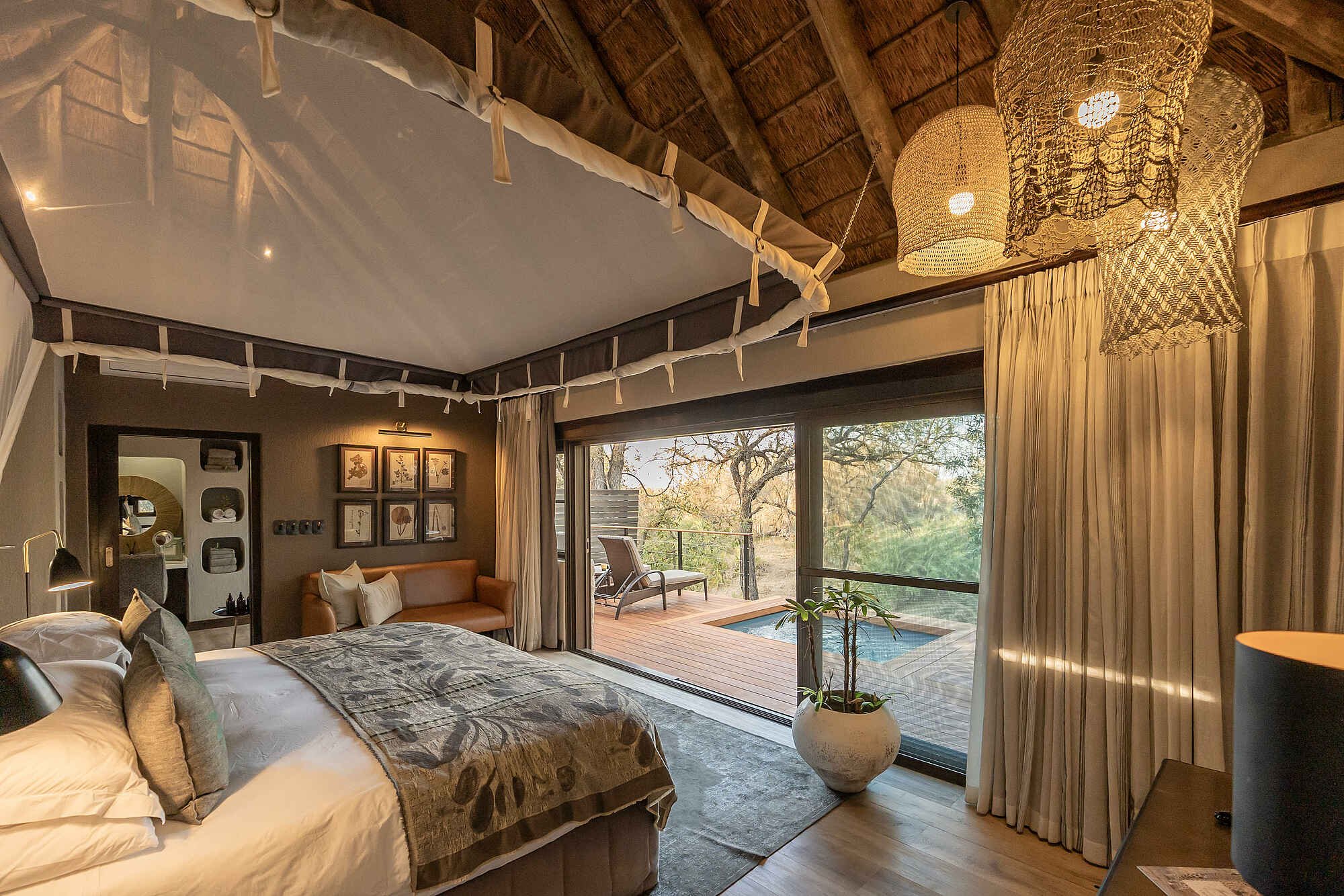 Die neun Suiten der Simbambili Game Lodge sind großzügig geschnitten und geschmackvoll eingerichtet. Große Fenster geben den Blick frei auf das saisonale Flussbett oder das umliegende Buschland. Jede Suite verfügt über ein eigenes Sonnendeck mit Tagesbett und einem privaten Plunge Pool, ideal für entspannte Stunden zwischen den Safaris. Die Einrichtung verbindet warme Holztöne mit natürlichen Stoffen und dezenten afrikanischen Elementen. Über dem komfortablen King-Size-Bett hängt ein Moskitonetz, ergänzt wird der Innenbereich durch einen Schreibtisch und bequeme Sitzgelegenheiten.