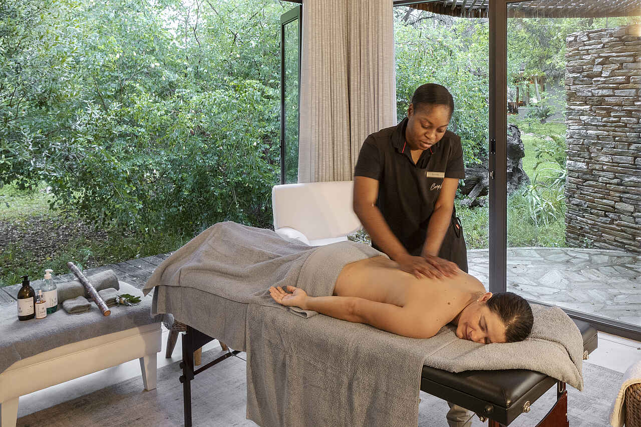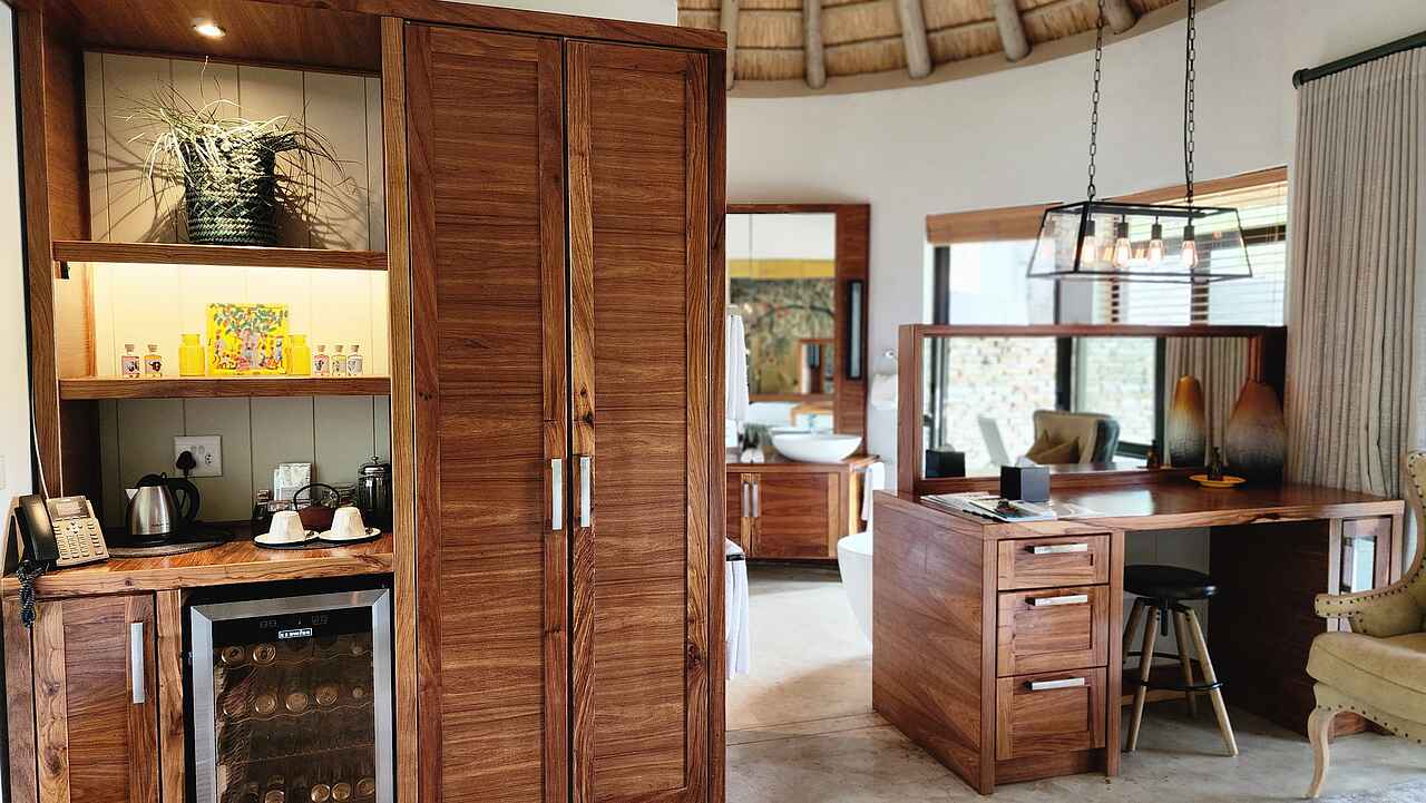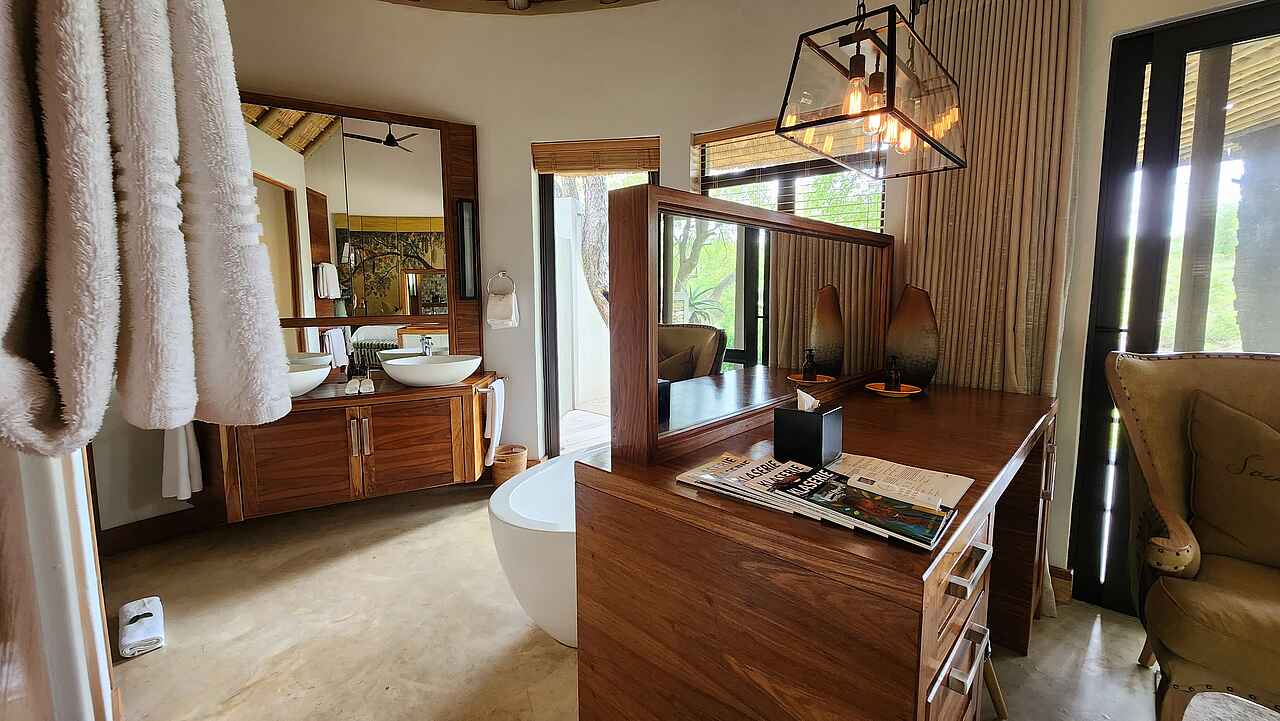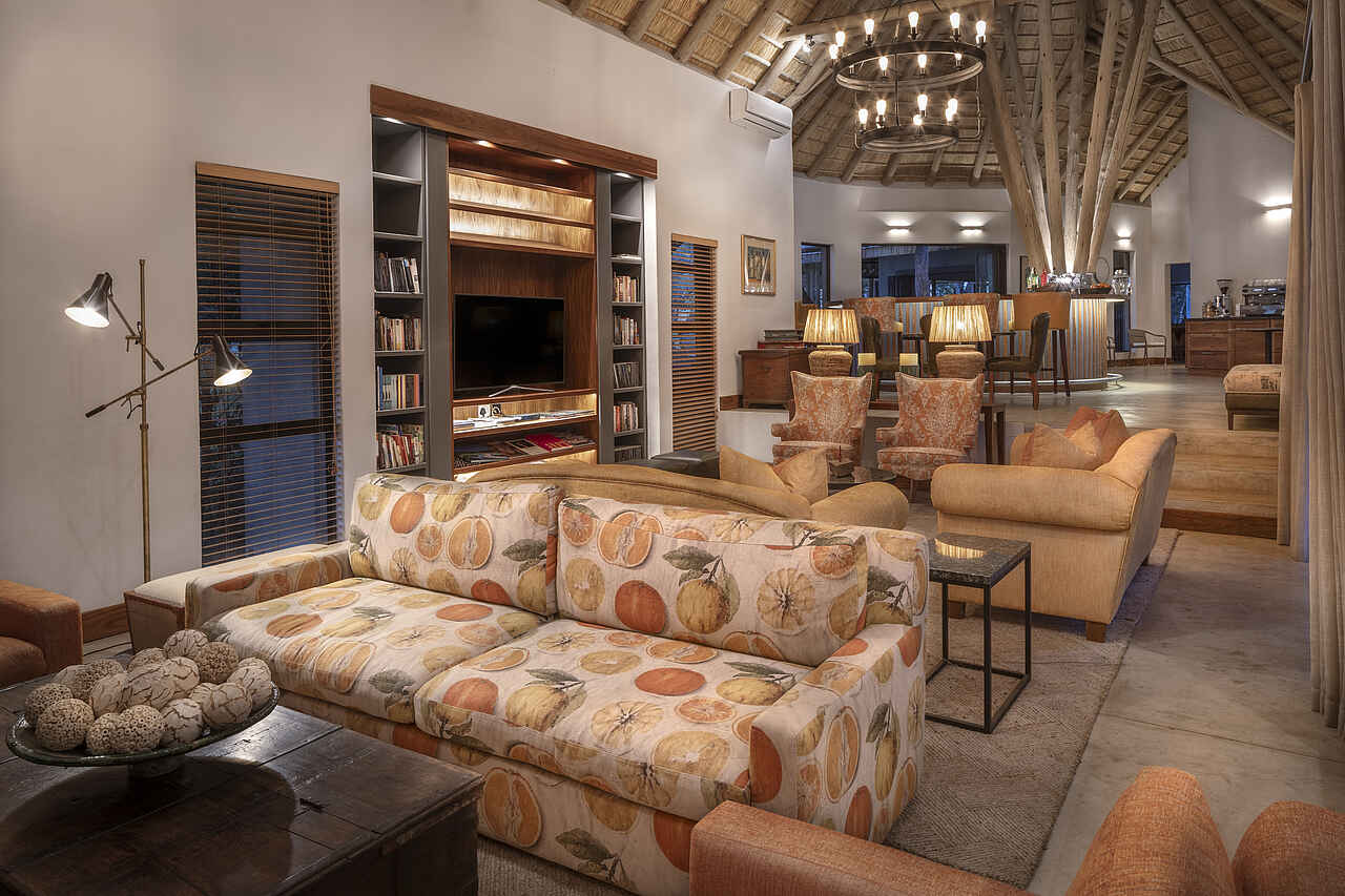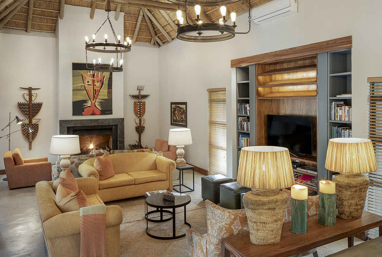 Das Herzstück des Camps ist die offen gestaltete Lounge mit Blick ins Grüne, in der eine kuratierte Sammlung moderner afrikanischer Kunst besondere Akzente setzt. Direkt daneben liegt der elegante Essbereich mit Show-Küche, wo das Küchenteam live und leidenschaftlich kocht. Draußen laden mehrere Veranden zum Verweilen ein, der Poolbereich bietet bequeme Liegen für entspannte Stunden unter freiem Himmel. Wer Bewegung sucht, nutzt den kleinen Fitnessraum, wer Ruhe braucht, genießt eine Spa-Behandlung oder beobachtet Tiere am nahen Wasserloch. Abends trifft man sich an der Boma und lässt den Tag bei einem Sundowner am Feuer ausklingen. Ein kleiner Shop bietet ausgesuchte Souvenirs und liebevoll gestaltete Accessoires.