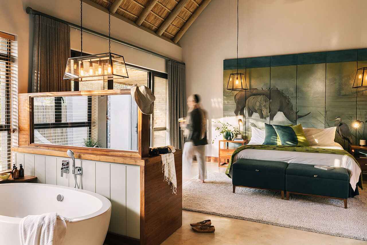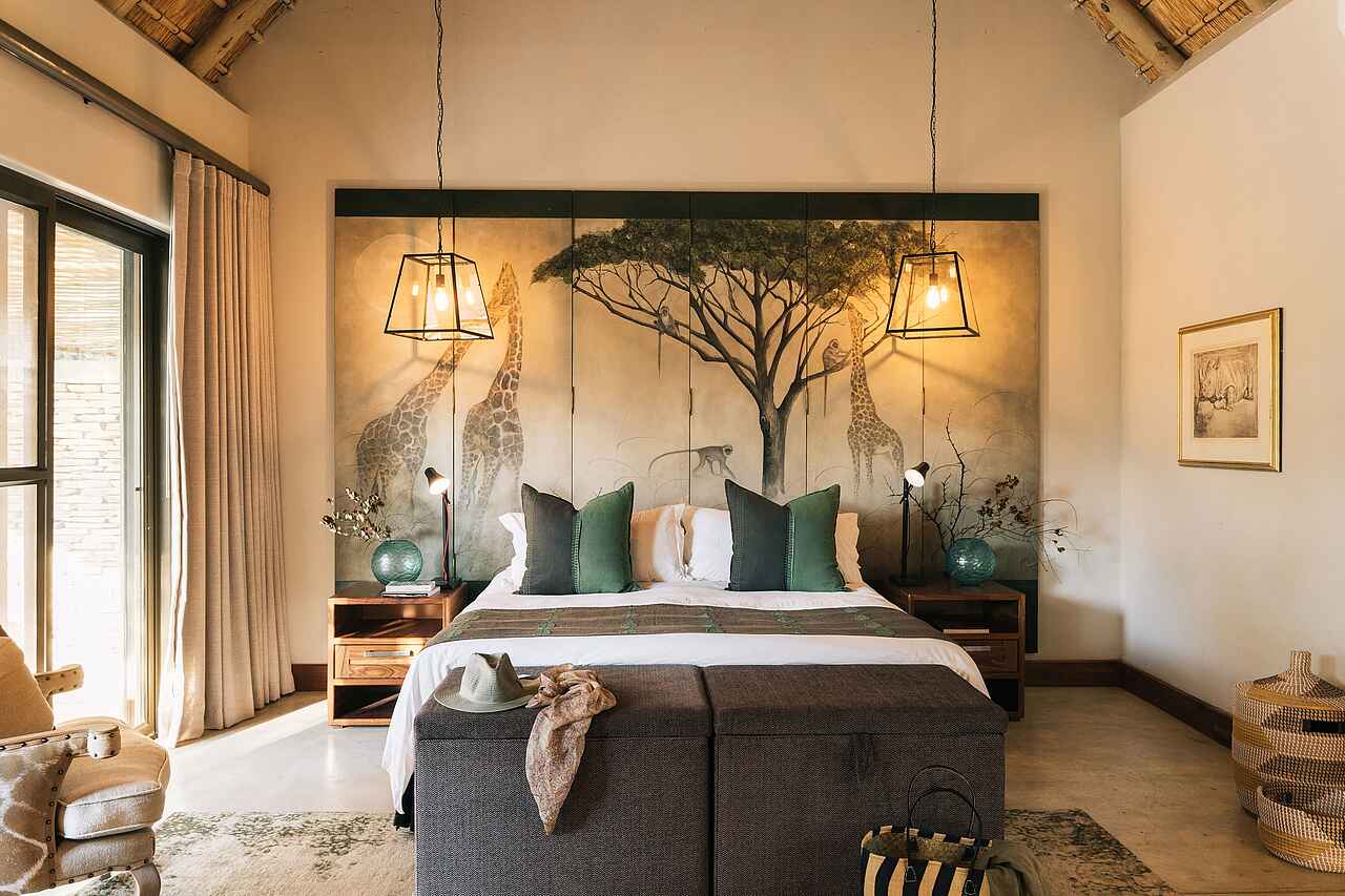 Die acht Suiten sind großzügig geschnitten und stilvoll eingerichtet, mit einer Mischung aus warmem Holz, sanften Stoffen und ausgewählten Details. Jedes Schlafzimmer wird von einem kunstvoll gemalten Wandgemälde geschmückt, das der Suite eine ganz eigene Note verleiht. Bequeme King-Size-Betten, Klimaanlage, Ventilator, Minibar sowie Tee- und Kaffeezubereitung sorgen für Komfort. Auf der privaten Terrasse schweift der Blick ins trockene Flussbett, das oft von Wildtieren durchquert wird. Die offenen Badezimmer verfügen über freistehende Badewannen, Innen- und Außenduschen, Doppelwaschbecken, hochwertige Pflegeprodukte, Haartrockner und weiche Handtücher. Zwei Suiten sind miteinander verbunden und damit perfekt für Familien geeignet.