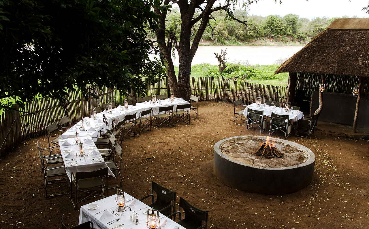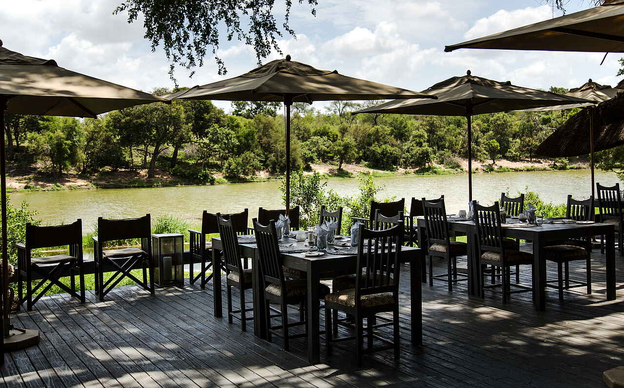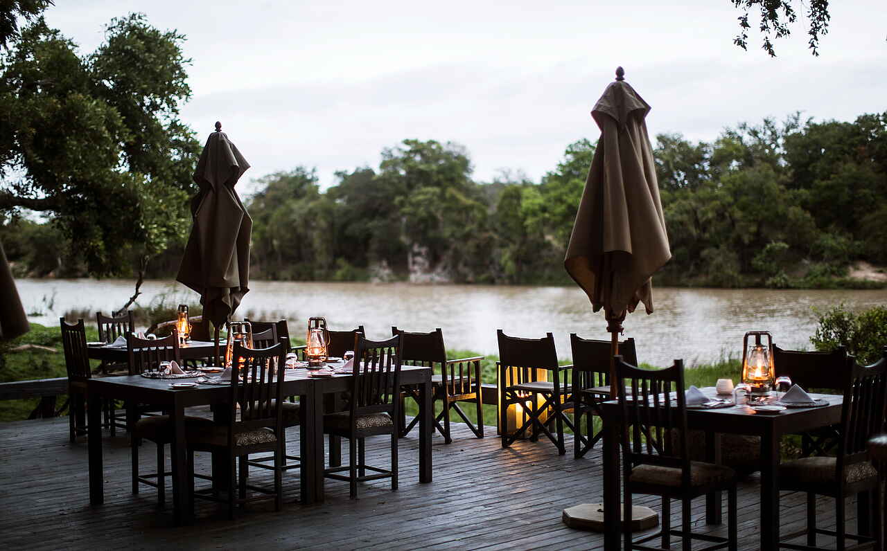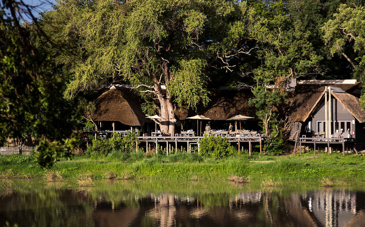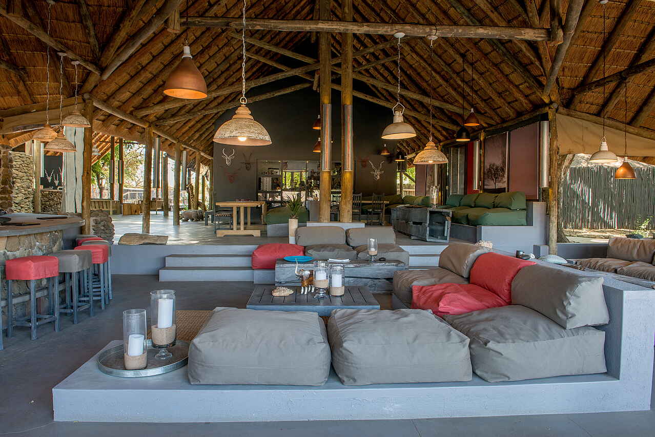 Lodge aus Holz am Ufer des Nhlaralumi Rivers. Hauptbereich der Lodge bietet Lounge mit Sofas und Sitzecken; Bar; Bibliothek; Spa-Bereich und Swimmingpool im Freien mit Liegen, sowie ein Kinder „Activity Center“; Große Terrasse die auch als Essbereich genutzt wird; Wifi; Boma Feuerplatz im Garten.