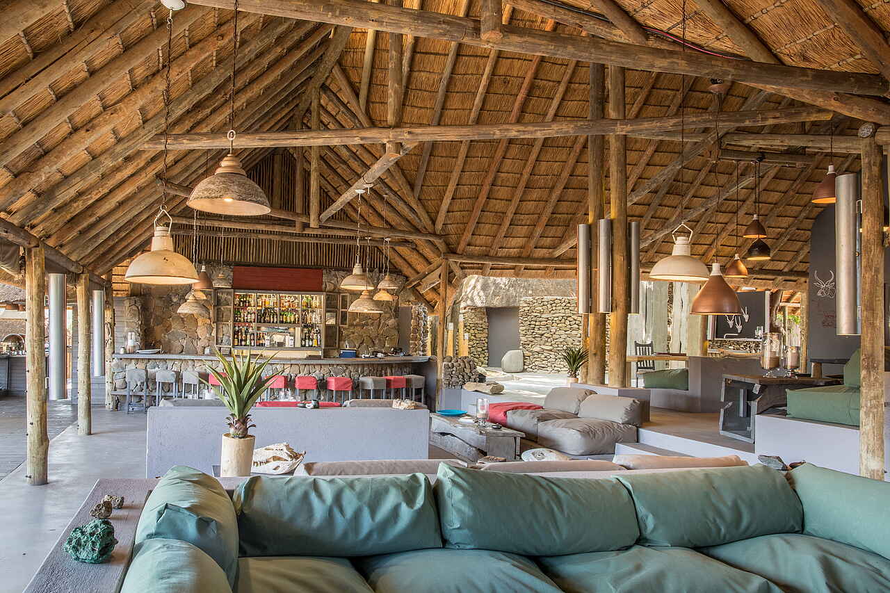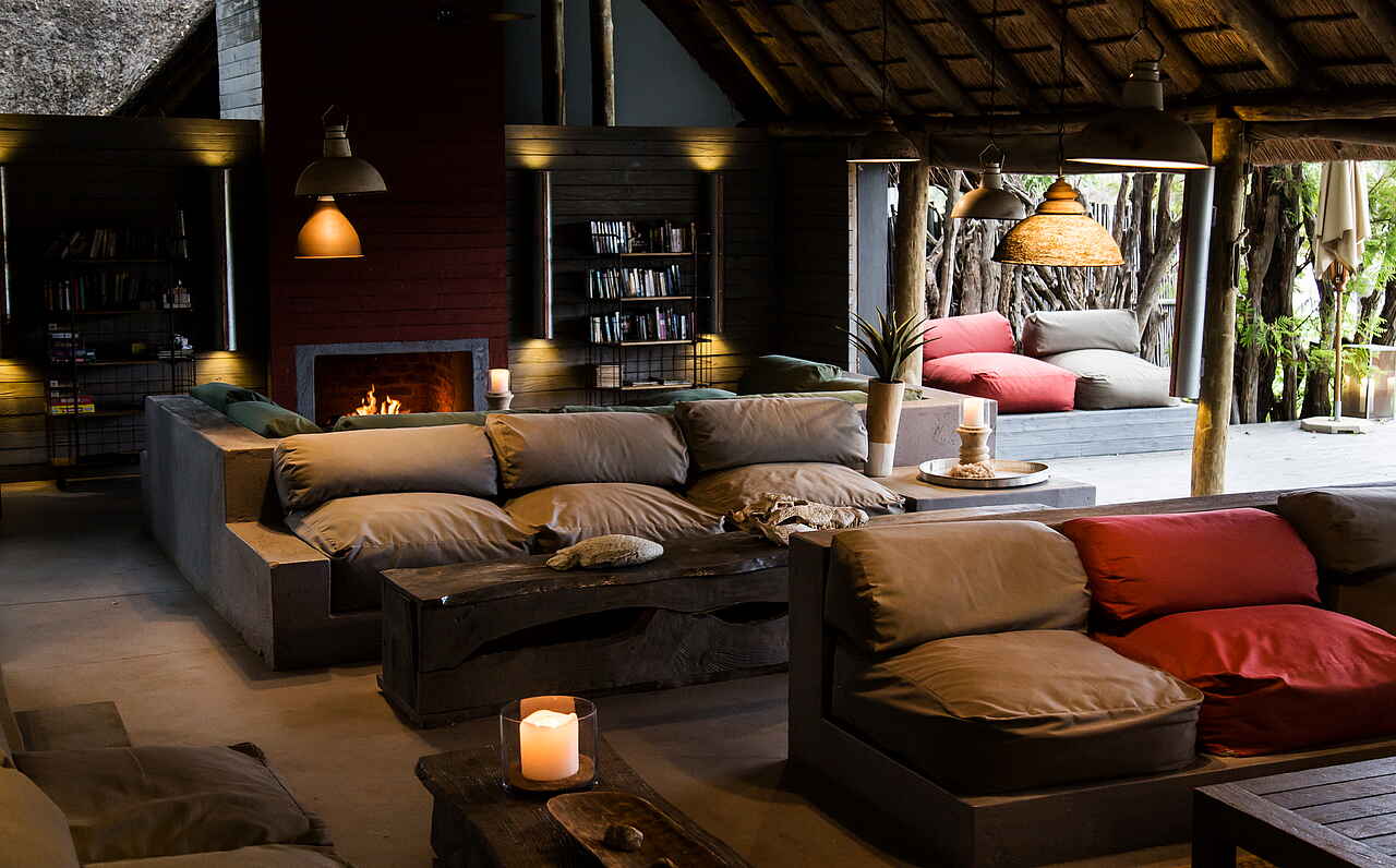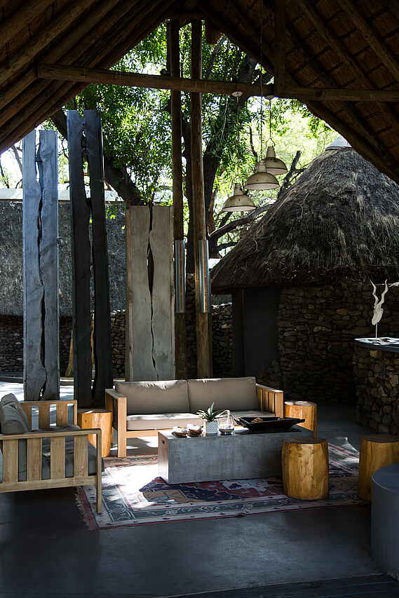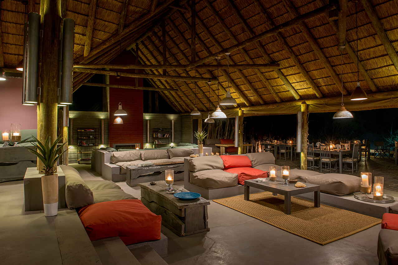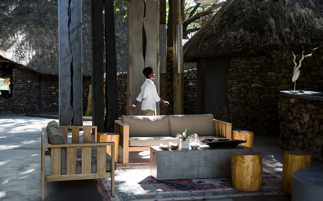 Lodge aus Holz am Ufer des Nhlaralumi Rivers. Hauptbereich der Lodge bietet Lounge mit Sofas und Sitzecken; Bar; Bibliothek; Spa-Bereich und Swimmingpool im Freien mit Liegen, sowie ein Kinder „Activity Center“; Große Terrasse die auch als Essbereich genutzt wird; Wifi; Boma Feuerplatz im Garten.