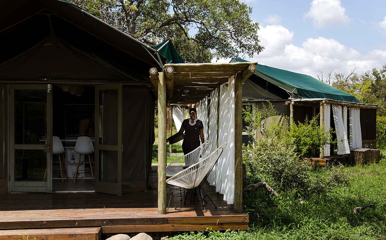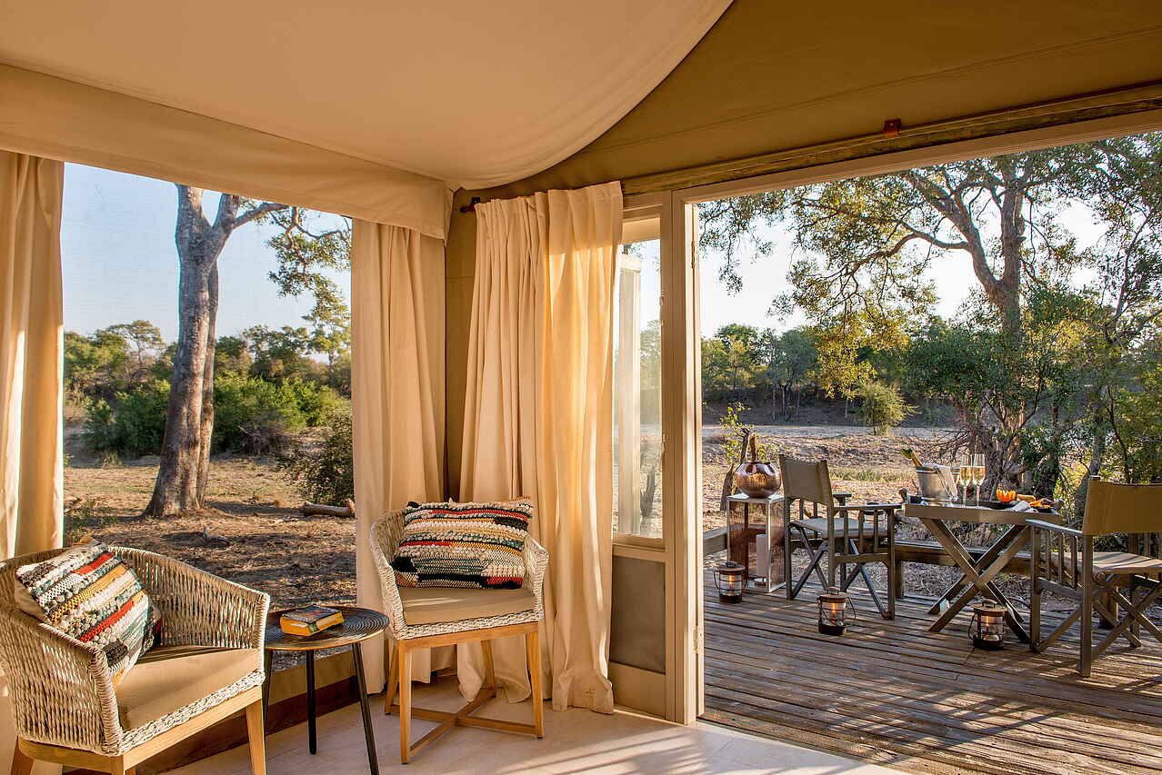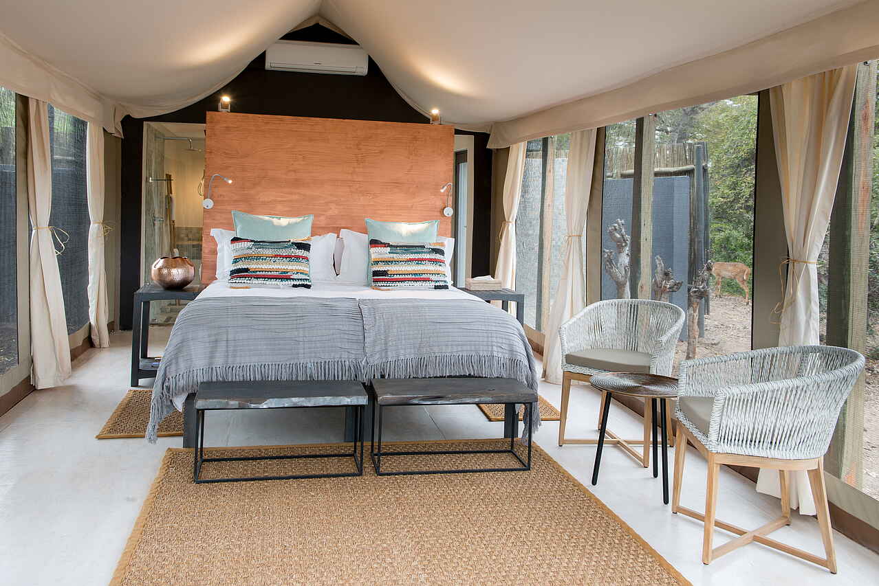 8 luxuriöse Safari Zelte, alle mit Doppelbett; Badezimmer variieren je nach Buchung: Entweder Outdoor-Dusche und Badewanne innen, oder Badwanne im Freien und Dusche innen; Zimmer beinhalten: 2 Adapter, inkludierte Pflegeartikel, Wasserkocher mit Tee und Kaffee, elektronische Heizdecken im Winter, umweltfreundliches Insektenspray Föhn, private Terrasse mit Blick in die Landschaft; alle Zimmer sind Nichtraucher Zimmer. Außerdem 3 Family Chalets, variierend mit jeweils 4 oder 5 Betten.