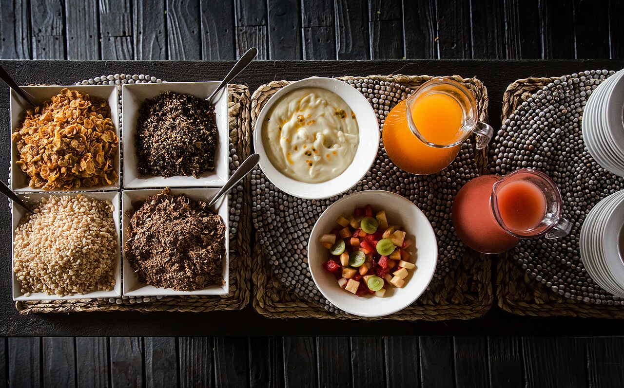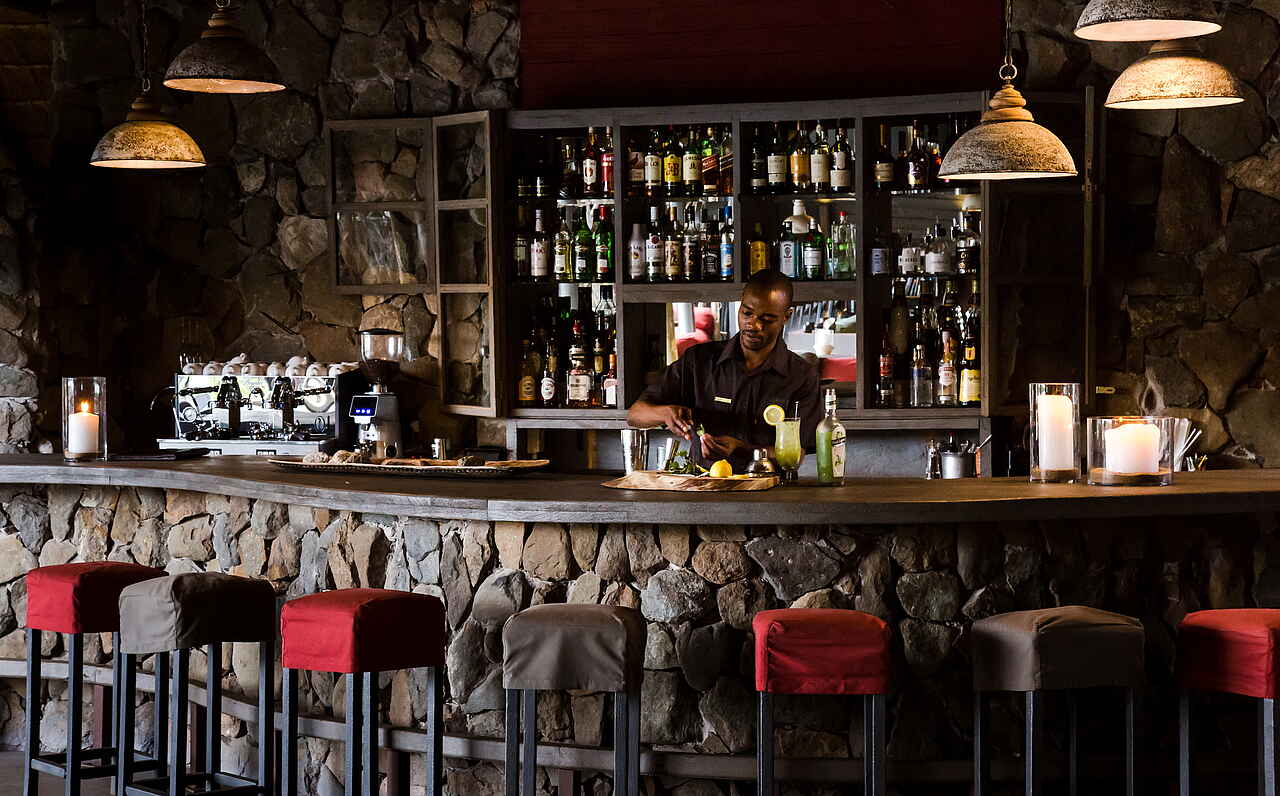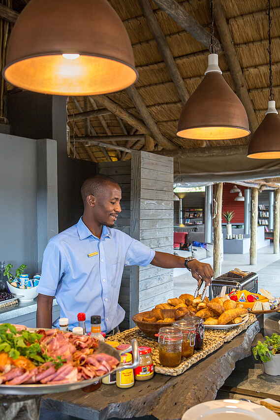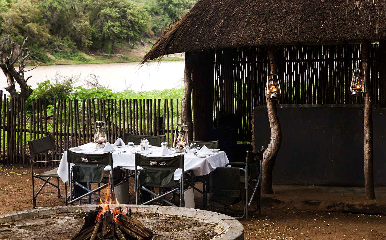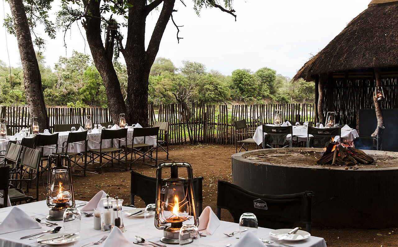 Tee, Kaffee und Snack am Morgen, dann erster Game Drive mit Kaffee Stop und Snack; danach Frühstück/Brunch und Freizeit; anschließend Mittagessen in Kombination mit Nachmittags-Tee mit Snacks; dann Nachmittags/Abends Game Drive mit Sundowner; je nach Wetter bei Rückkehr mehrgängiges Dinner an seperaten Tischen auf der Terrasse oder im Garten in der Boma. Diäaten jeder Art werden bei Mitteilung berücksichtigt.