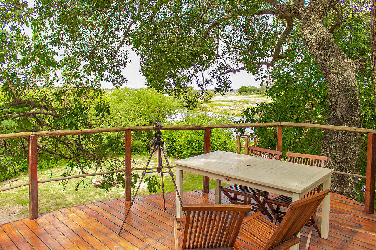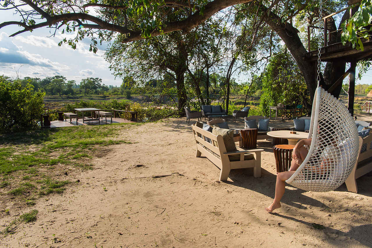 Offenes Gebäude im Zentrum der Insel mit einer gemütlichen Lounge und einem Aussichtsdeck auf einer hohen Plattform. Unter den Bäumen verteilt stehen schöne Bänke mit Blick auf den Fluss.