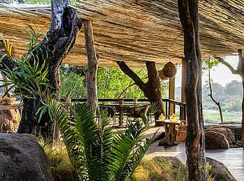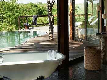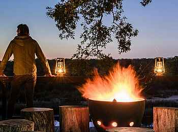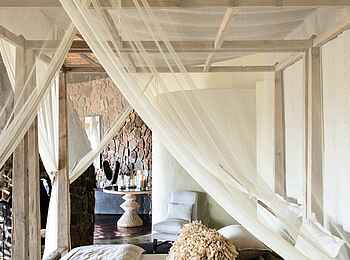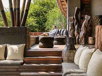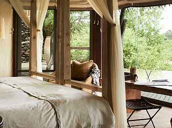 Die Singite Boulders Lodge bietet Ihnen 10 private Suiten mit je einem Schlafzimmer und zwei Familiensuiten mit je zwei Schlafzimmern. Befestigte Wege verbinden die einzelnen freistehenden Suiten mit der Hauptldoge. Der moderne Einrichtungsstil bietet feine Stoffe, Erdfarben, Naturstein und Echtholz. Dekorationselemente aus Naturmaterialien verleihen den Räumlichkeiten eine gemütliche Atmosphäre. Es gibt 8 Suiten der Kategorie River Suite mit direktem Blick auf den gegenüberliegenden Sandriver und zwei Busch Suiten mit Blick auf ein rege besuchtes Wasserloch und die unberührte Wildnis. Die beiden Familiensuiten liegen nebeneinander und können für größere Gruppen oder Familien auch miteinander verbunden werden. Sie bieten jeweils einen Eingangsbereich mit Lounge, separater Toilette und einer Seite eines großen doppelten Stein-Kamins. Die andere Seite des Kamins geht hin zum großen Master-Schlafzimmer mit angrenzendem en-suite Badezimmer, ausgestattet mit Spültoilette, doppeltem Waschtisch, freistehender Badewanne, Indoor- und Outdoordusche und fließend Kalt- und Warmwasser. Sowohl von der Lounge als auch vom Schlaf- und vom Badezimmer führt ein Zugang zum privaten Aussichtsdeck mit einem beheizten Swimmingpool. Im hinteren Bereich der Familiensuite befindet sich ein kleineres Twin-Schlafzimmer mit getrennten Einzelbetten für zwei Kinder oder zwei Erwachsene. Auch hier gibt es ein privates, kleineres en-suite Badezimmer mit WC, einfachem Waschbecken, und einer Badewanne. Ein direkter Zugang führt Sie zu einem kleinen eigenen Aussichtsdeck mit einer Outdoor-Dusche. Zwischen den beiden Familiensuiten gibt es einen großen Bereich mit einem gemeinsam nutzbaren Ess- und Loungebereich und einer steinernen Feuerstelle, von dessen Terrasse aus direkt Pirschfahrten und Touren begonnen werden können. Die Ausstattung in den River- und Busch Suiten besteht aus einem großen zusammenhängenden Raum, der sich in drei Bereiche gliedert. Diese sind Schlafzimmer, Lounge und Badezimmer. Allesamt verfügen über eine Glasfront und einen direkten Blick auf ein privates Aussichtsdeck und auf die weite Natur, so dass der Eindruck erweckt wird, man befände sich stets inmitten der Wildnis. Im Bereich der großzügigen Lounge gibt es eine lange Couch und mehrere Sitzgelegenheiten, einen Couchtisch aus massivem Holz mit einer Glasplatte und als Highlight einen breiten Kamin aus Stein. Auf der gegenüberliegenden Seite des doppelten Kamins befindet sich der Schlafbereich, so dass Sie sowohl im Wohn- als auch im Schlafbereich ein knisterndes Feuer genießen können. Der Schlafbereich umfasst ein King-size Bett im Stile eines Himmelbettes mit Moskitonetz, einen Schreibtisch und mehrere Ablageflächen. Angrenzend erwartet Sie ein luxuriöses en-suite Badezimmer mit fließend Kalt- und Warmwasser. Hier gibt es eine Spültoilette, eine Indoor- und eine Outdoordusche, eine freistehender Badewanne, Handtuchhalter in Baumoptik und einem doppelten Waschtisch mit einer massiven Steinplatte. Das privates Aussichtsdeck ist durchsetzt von einzelnen emporragenden Bäumen und bietet Liegestühle mit Polstern sowie einzelne Sitzgelegenheiten und einen Infinity-Pool mit Blick auf die weite Natur. Zudem gibt es einen Stromanschluss mit 220 Volt, eine Klimaanlage und einen Wäscheservice inklusive.