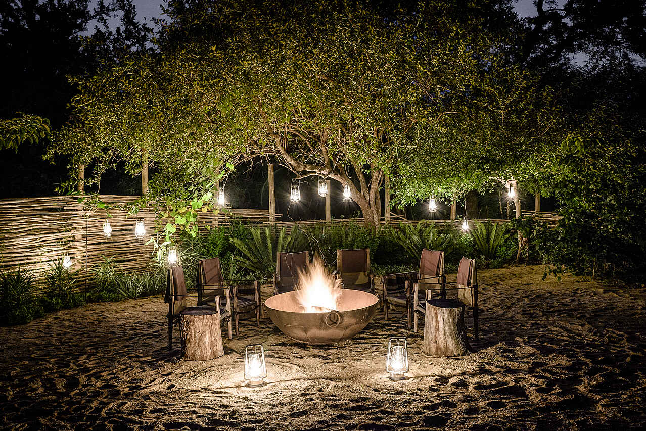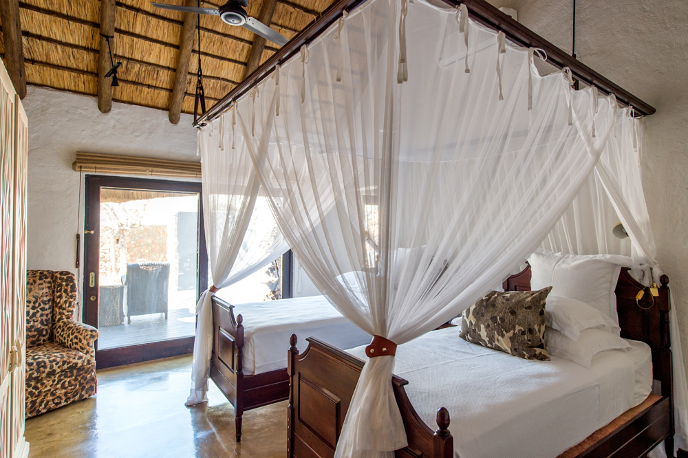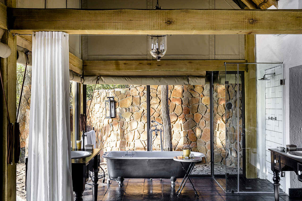 10 Suiten, davon 2 Interleading, in 9 einzeln stehenden Chalets. 7 liegen direkt an der Steilstufe des Flussufers, ca. 15 Meter auseinander; 2 direkt nebeneinander im Busch mit Blick in denselben. Zusätzlich die private Ebony Villa mit 2 Familiensuiten für max. 8 Personen abseits der Chalets. Die mit eigenem Pool, Lounge, Boma, Fahrer und Fahrzeug. Alle Suiten in schlichtem, antiquierendem Kolonialstil. Hohe strohgedeckte Chalets mit großem Schlafzimmer als Hauptraum mit Glasflügeltüren zur Veranda; mit King Size Bett unter Moskitonetz und Ventilator, direktem Zugang zum Bad. Das mit Separatem WC 2 Waschbecken, freistehender Badewanne, Dusche, Toilettenartikeln, Handtüchern, Fön; direkter Zugang zur Outdoordusche auf der Veranda; die mit Plungepool und gemütlicher Sitzgruppe. Strom und Adapter vorhanden.