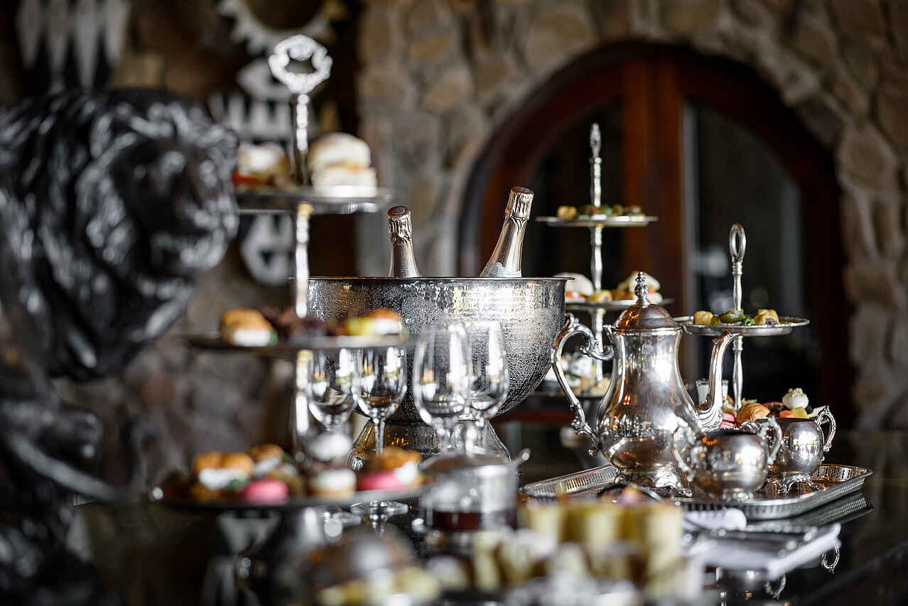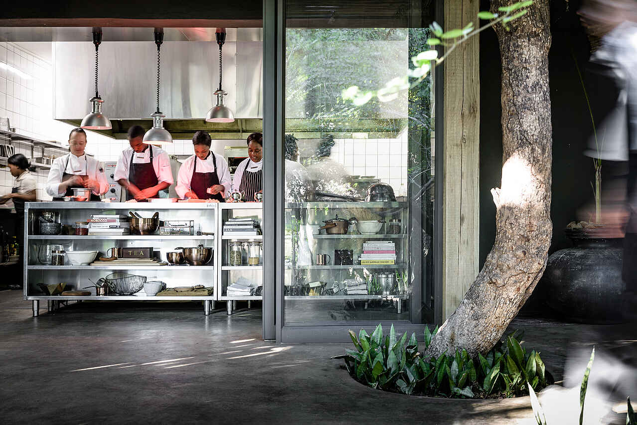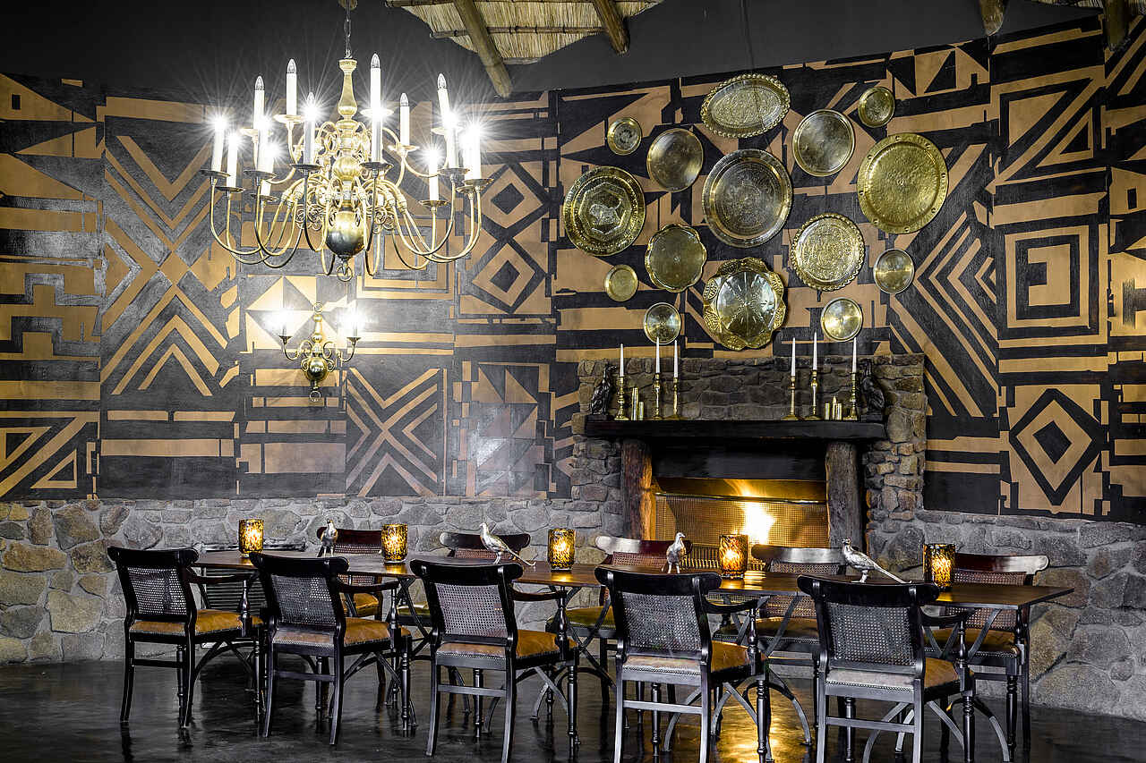 7 Mahlzeiten: Früher Snack, Kaffeestopp und Sundowner auf Pirschfahrt, Brunch, Lunch, Dinner; im Speisesaal, auf der Veranda oder in der Boma; am Gemeinschaftstisch oder Einzeltischen, private in-suite Dining möglich, Bush Breakfast, Busch Dinner, Airstrip Dinner, Wine Gallery vorhanden; interaktive Küchen, aller Diäten können berücksichtigt werden, bitte anmelden.