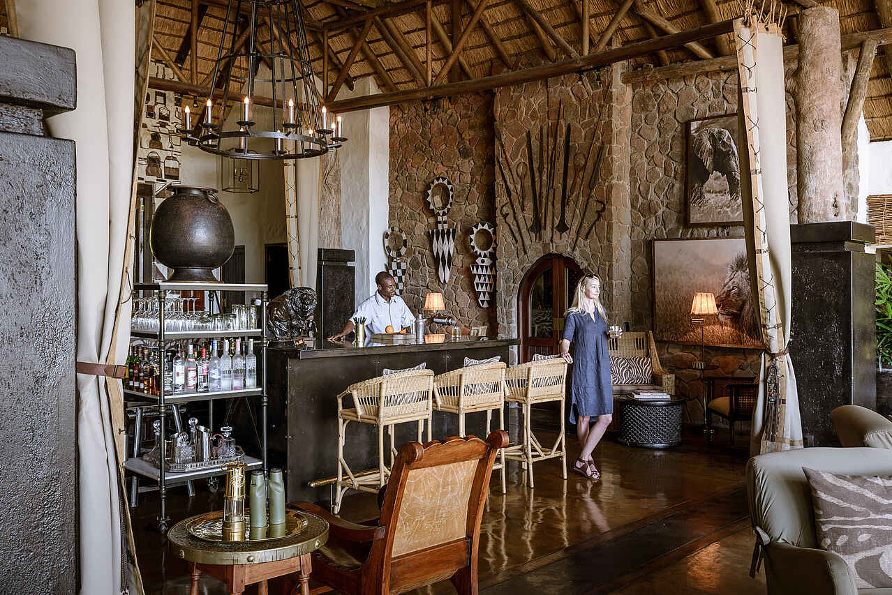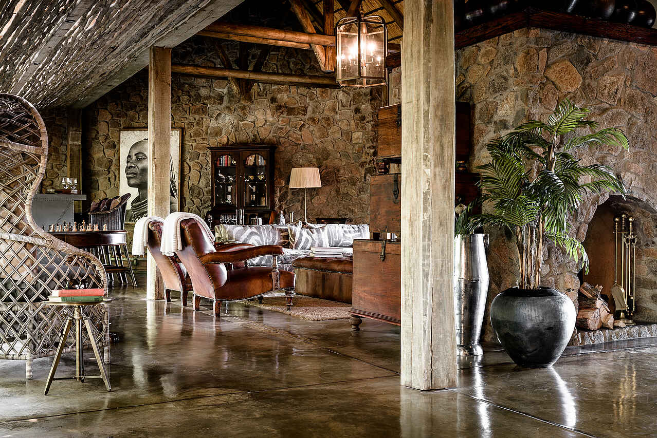 Ca. 15 Meter hohes strohgedecktes Haupthaus aus unverputztem Naturstein mit hohem, offenem Dachstuhl. Insgesamt gediegen-antiquierendes Design mit zahlreichen Schwarzweißfotografien, Wurfspeeren und ähnlichen kunstvollen Artefakten. Große Lounge mit 2 Kaminen und Bar die direkt in die Veranda und Terrasse übergeht. Von dort Blick auf den Fluss, insbesondere von offener Feuerstelle aus. Stilvoller Speisesaal und Boma sind vorhanden, so auch kleiner Pool mit ca. 15 auf 3 Metern. Mit Spa und Gym, kleiner Boutique; kleine Bibliothek mit Fernsehmöglichkeit, WiFi, ggf Mobilfunkempfang; elektrischer Strom mit 220 V vorhanden.