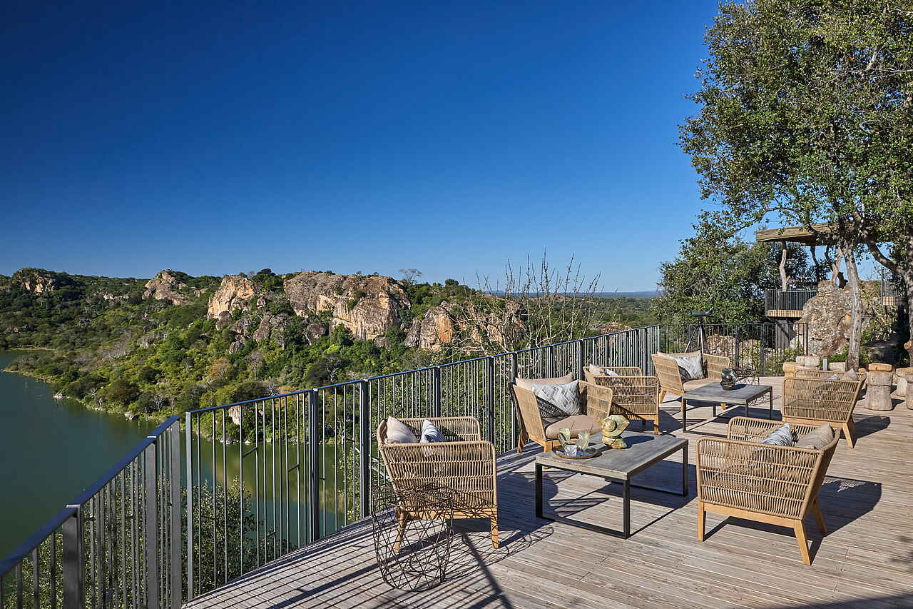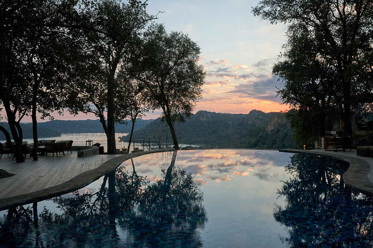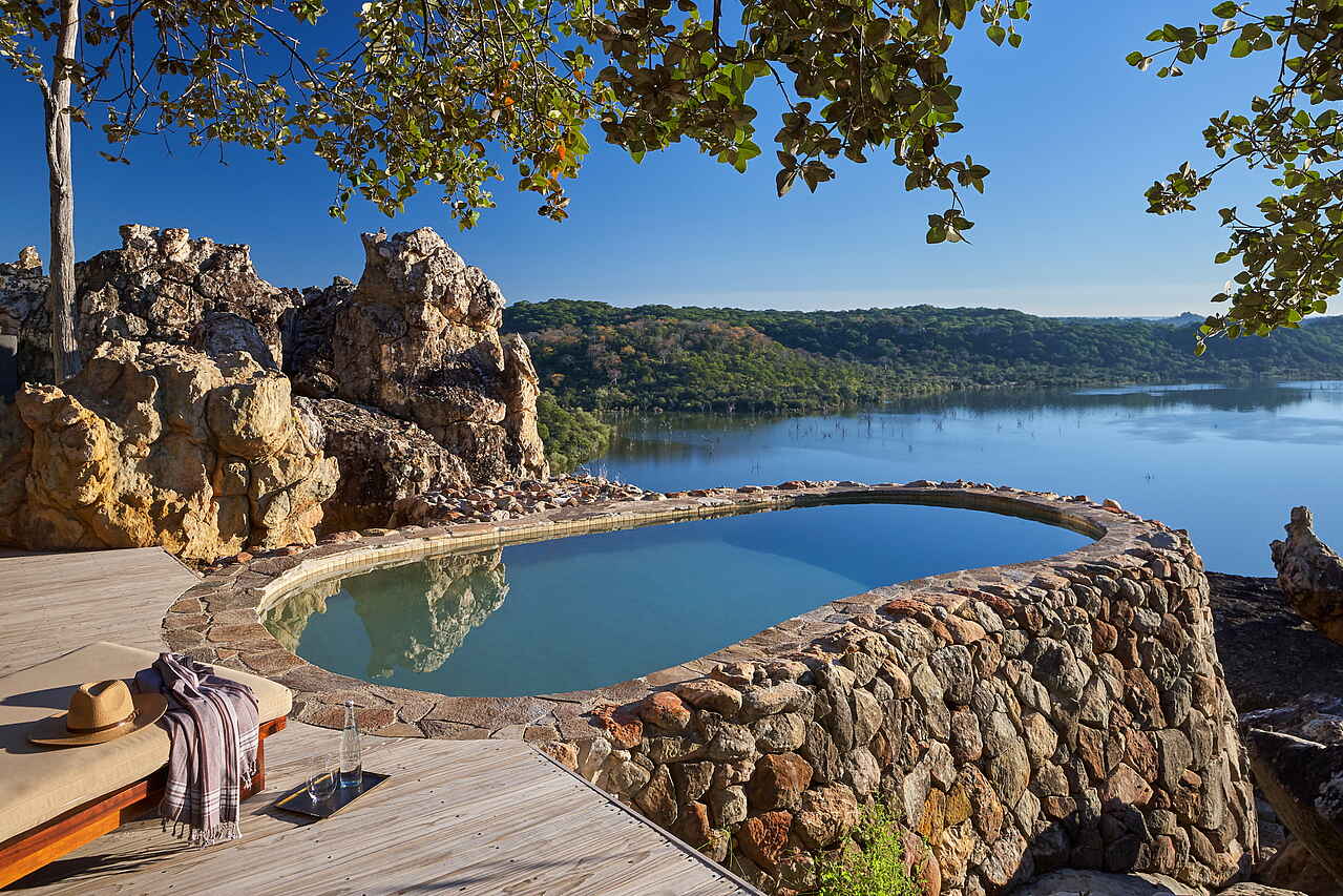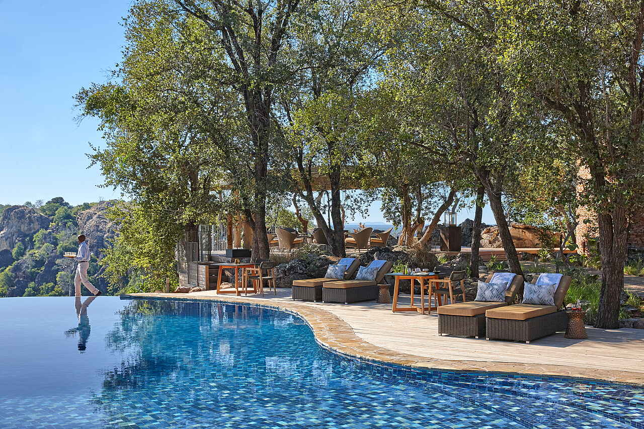 Die Lodge im luxuriösen Stil ist auf ein hohes Felsplateau gebaut und fügt sich in ihrer Architektur harmonisch in die Umgebung aus Busch und Bäumen ein. Die spezielle Bauweise ermöglicht es, dass sowohl vom Poolbereich des Hauptgebäudes als auch von den Aussichtsplattformen der einzelnen Suiten ein weitläufiger Ausblick auf den Malilangwe-See und das Mailiangwe Wildlife Reserve möglich ist.