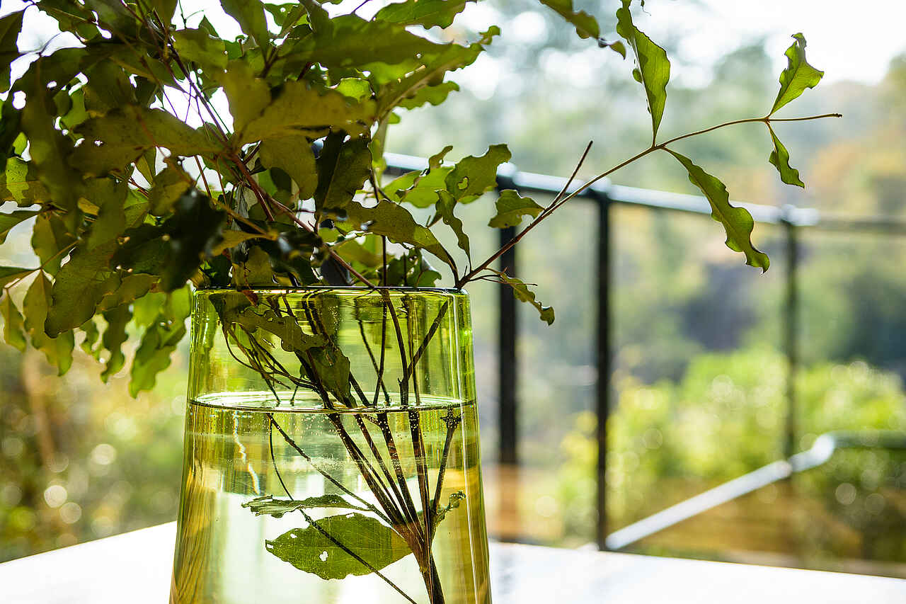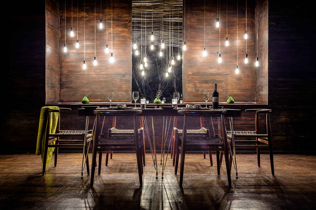 Das Hauptgebäude wurde baumhausartig in den Ästen der Bäume aus Glaswänden und Holz errichtet. Hier finden sich die Lounge, der Speisebereich und ein Sonnendeck mit Pool sowie ein Weinkeller und eine kleine Boutique. Alle Räume sind mit dunklen Holzmöbeln wie Sesseln, Sofas, Stühlen, Tischen, Sideboards und Sonnenliegen eingerichtet, die durch helle und farbenfrohe Textilien und Polster sowie dunkles Leder ergänzt. Teilweise herrscht Mobilfunkkonnektivität und es besteht ein WiFi-Netz.
