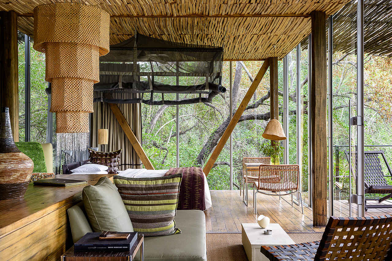 Die Singita Sweni Lodge wurde wie ein Baumhaus mit großen Glaswänden in den Ästen der Bäume errichtet. Auf den privaten Terrassen der Gästeunterkünfte gibt es Tagesbetten.