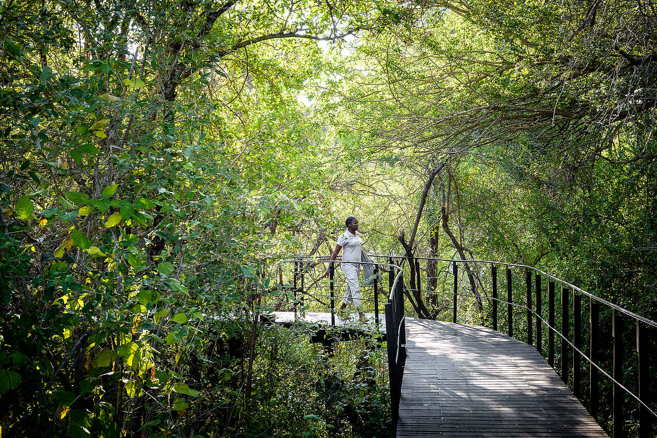 Die Lodge liegt erhöht inmitten von Baumwipfeln und überblickt das Ufer des Sweni Rivers. Hier im 33000 ha großen privaten Konzessionsgebiets Singita im Südosten des Kruger National Parks wurde die Lodge in Südafrika in nächster Nähe zur Landesgrenze mit Mosambik errichtet.