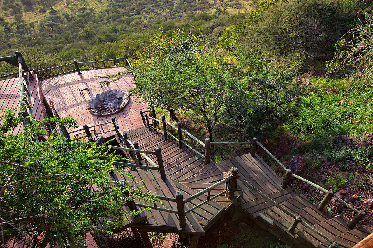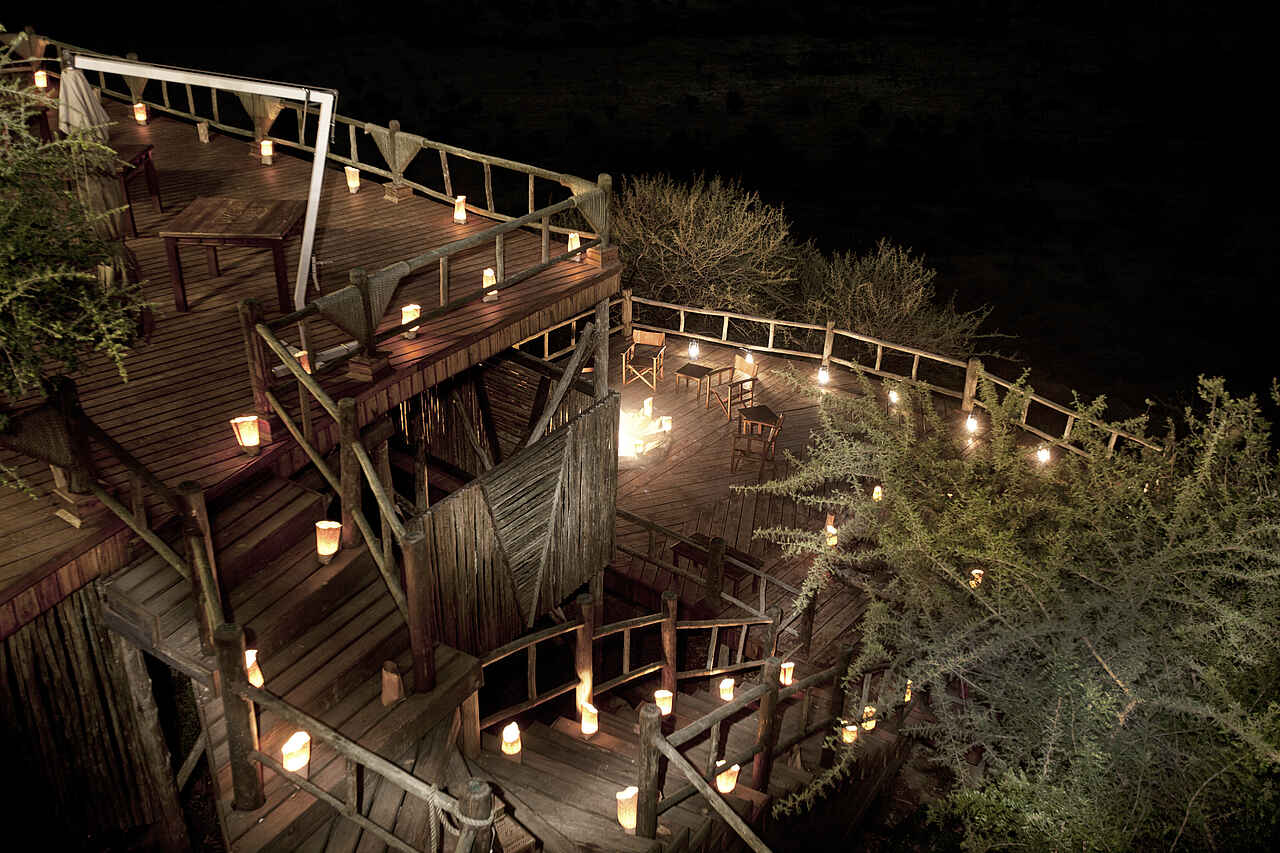 Die Lodge liegt am Rande eines Plateaus mit bestem Blick nach Westen. Der Standort wurde speziell für den Blick ausgewählt. Reetgedecktes Hauptgebäude mit drei Ebenen: Oberste Ebene mit Restaurant, Lounge, Leseecke, Empfangsbereich und einer kleinen Bühne für Tanzvorführungen. Eine Ebene tiefer eine offene Aussichtsplattform, auf der bei gutem Wetter auch die Mahlzeiten serviert werden; daneben eine weiterer, überdachter Speisebereich, der mit einer Treppe mit der oberen Niveau verbunden ist. Auf halber Treppenhöhe eine Schauküche. Auf der untersten Ebene noch ein kleineres Deck mit zwei Feuerplätzen. Nördlich vom Hauptgebäude, ebenfalls mit weitem Blick, eine Swimming Pool, der von einer Zierbrücke überspannt wird. Talwärts 2 Plattformen mit Sonnenschirmen und Liegestühlen auf 2 Ebenen, die untere Ebene erreicht man über die Brücke. Zentrale Toiletten neben dem Speisebereich auf der mittleren Ebene.