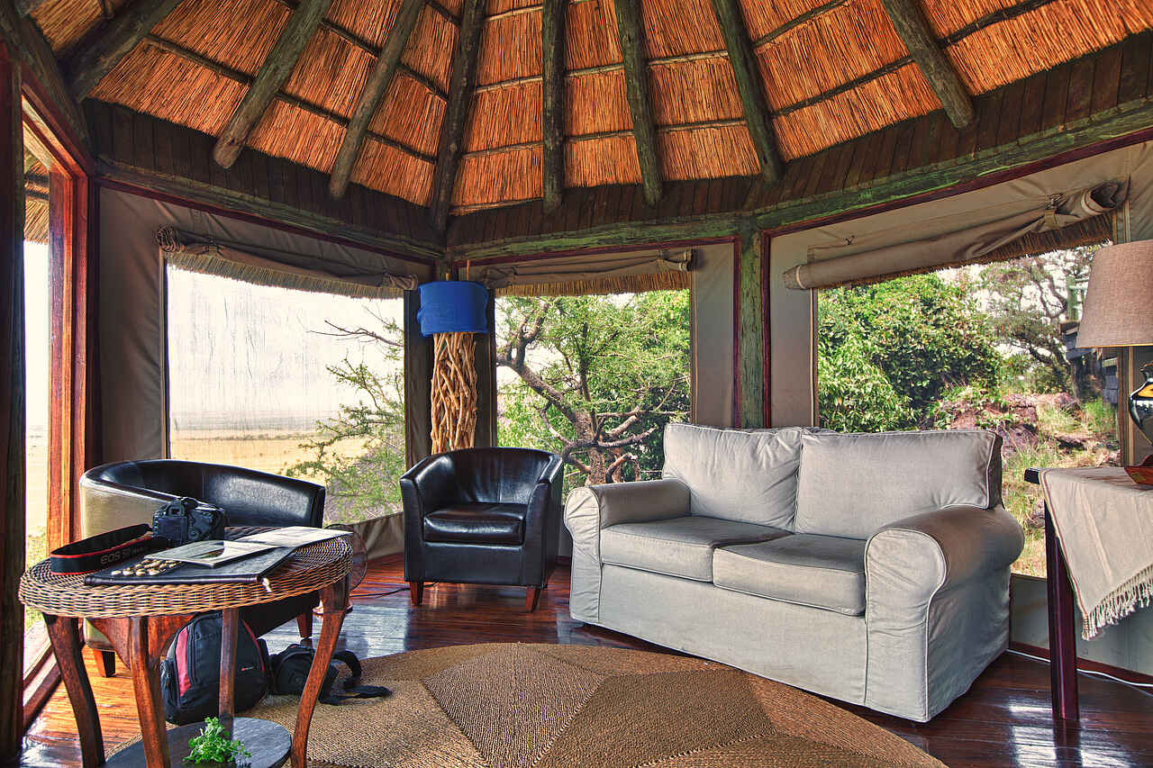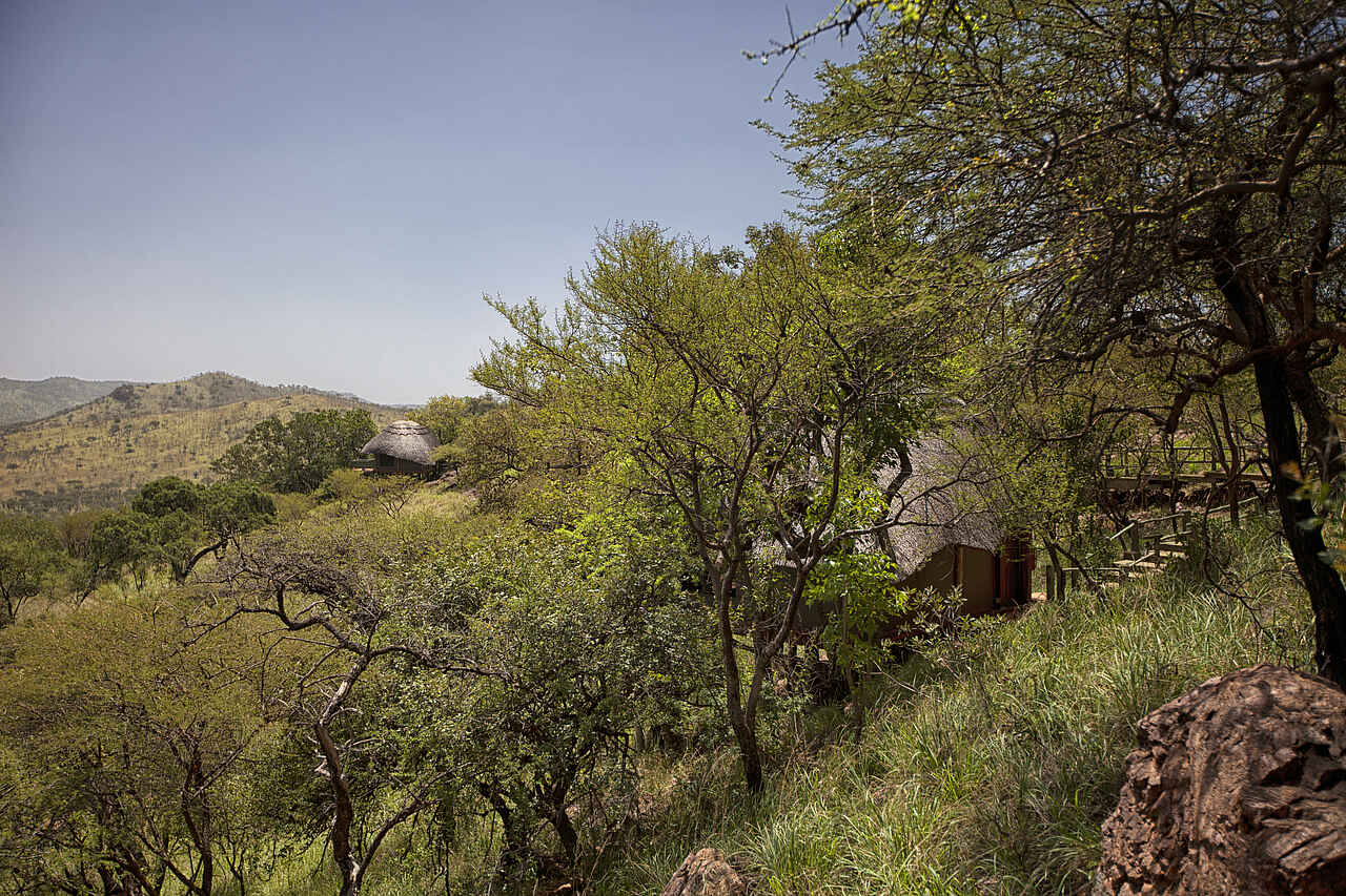 25 individuelle, reetgedeckte Chalets, die mit dem Hauptgebäude erst Treppen, dann über ebene Fahrwege verbunden sind. Die Gäste werden mit Elektromobilen zu den Chalets gefahren. Alle Chalets haben Blick auf die 100 Höhenmeter tiefer gelegenen Musabi Plains, allerdings in unterschiedliche Richtungen. Einige der Chalets sind Suiten mit 65m2 Fläche, alle anderen sind regulären Chalets mit 45m2 Fläche. Suiten und Standardchalets gibt sowohl mit Doppel- als auch mit Einzelbetten. Die Chalets sind mit Glasschiebetüren versehen, so daß man auch innen bei geschlossenen Türen den Blick hat. Alle Chalets verfügen über private Aussichtsterrassen und private Bäder mit Doppelwaschtischen, Dusche, WC und fließend Kalt- und Warmwasser. Die Suiten haben Badewannen und Außendusche und etwas komfortablere Möbel auf der Terrasse und in der privaten Lounge.