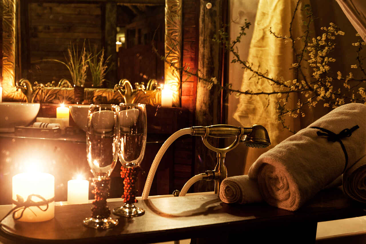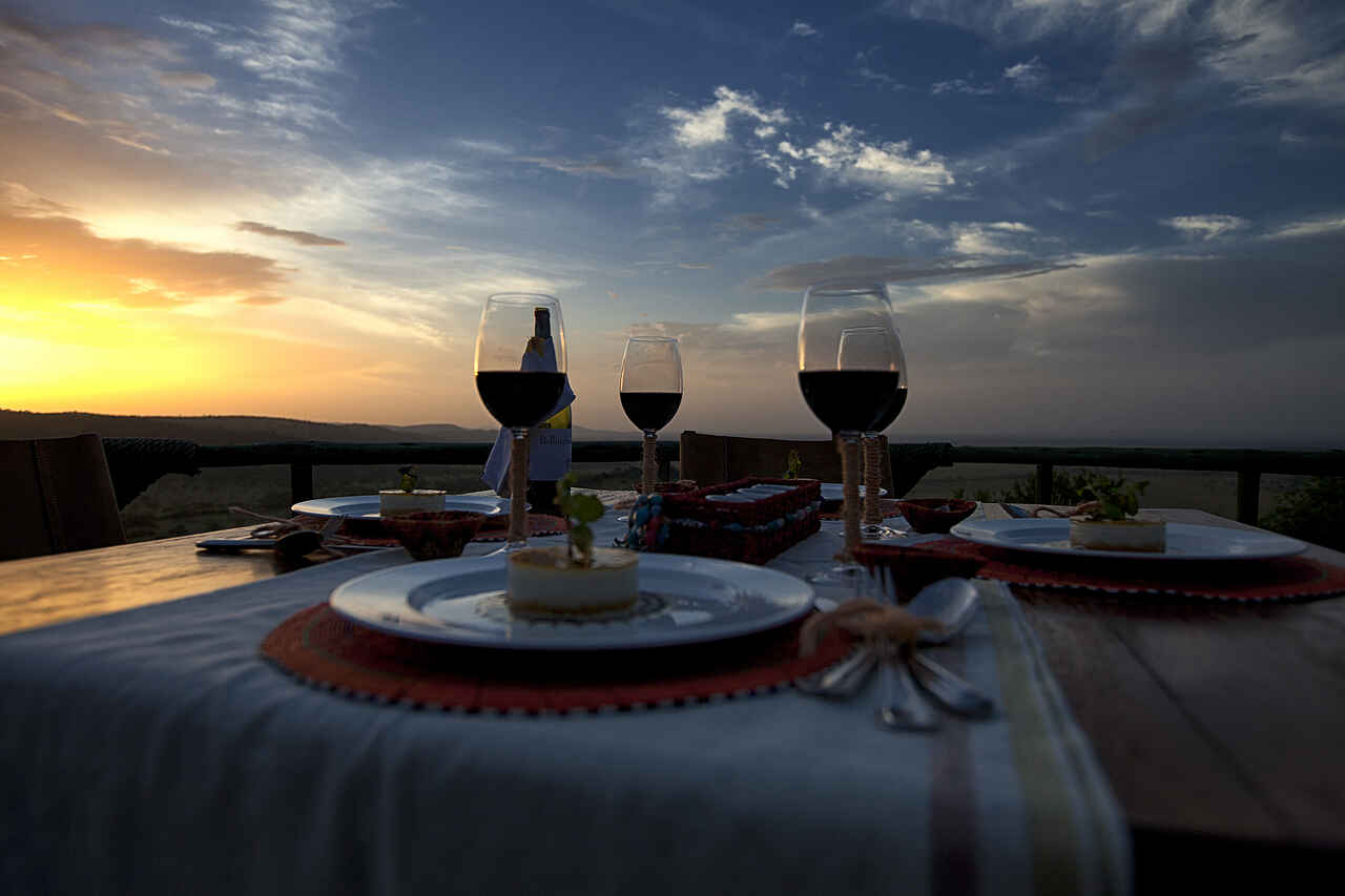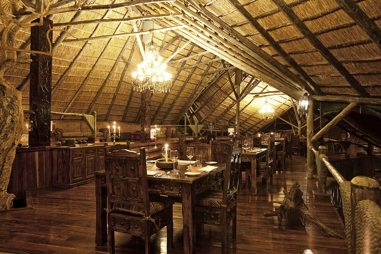 Es wird auf Basis von Halbpension oder Vollpension gebucht. Getränke mit separater Abrechnung. Lunchpaket auf Anfrage. Mahlzeiten werden meist private/individuell eingenommen, entweder im Restaurant oben, im überdachten bereich auf der mittleren Ebene oder im Freien auf einem der beiden Decks. Kindergerichte auf Wunsch. Es gibt eine kleine Schauküche. Buschfrühstück nach optionalen Ballonfahrten.