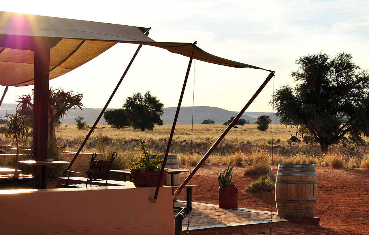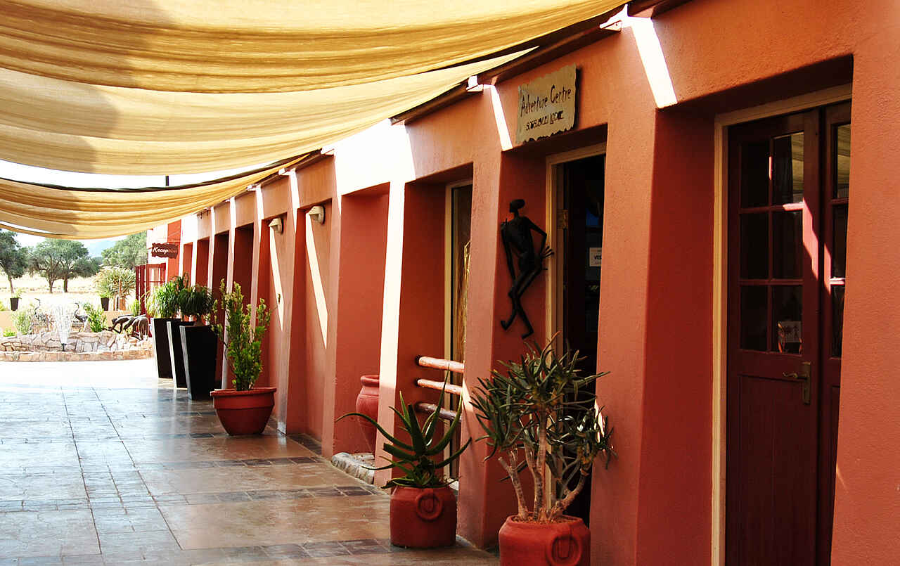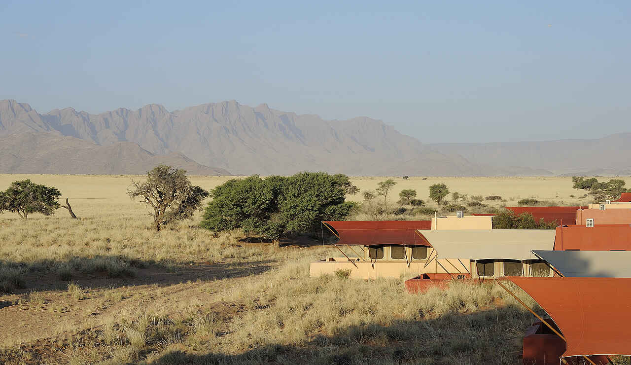 Nachhaltige Lodge, unmittelbar am Zufahrtstor zum Namib-Naukluft-Nationalpark. Luxuriöse Ausstattung und große Angebotsvielfalt bzgl. Aktivitäten und Touren. Im nordafrikanischen Stil erbaute Lodge, Eingangstor mit Parkplatz und kleinem Vorgarten. Hauptbereich mit Rezeption, Lounge, kleinem Souvenirladen, Bar und dem Adventure Center der Anlage. Großer Speisesaal mit Grillbereich und weitläufiger Terrasse. Im Vordergrund der Lodge liegt kleiner Pool und ein Biergarten. Bei Nacht beleuchtetes Wasserloch liegt direkt vor der Terrasse, guter Aussichtspunkt. Großer Konferenzraum für bis zu 100 Menschen, auch für andere Veranstaltungen geeignet. Verwendung überwiegend natürlicher Baustoffe, Lehmsteinwände und Zeltstrukturen. Alter Wasserturm dient als Aussichtsturm, Blick auf die Namib Wüste. Klimaanlage vorhanden. Kaffe- und Teestation in der Lounge. Nahtlose Integration in die trockene Graslandschaft. Wäscheservice verfügbar.