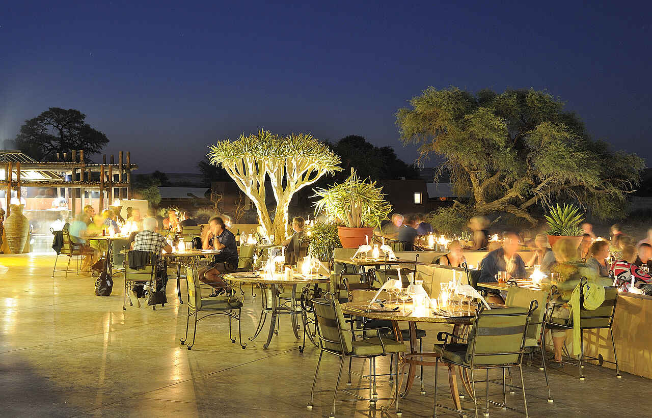 Die Sossusvlei Lodge ist eine luxuriöse und umweltfreundliche Anlage, nur ca. hundert Meter vom Eingangstor in den Namib-Naukluft-Nationalpark entfernt. Adventure Center mit großer Vielfalt an Aktivitäten und Touren. Mit Flutlicht angestrahltes Wasserloch von Außenterrasse gut sichtbar. Touren in die Namib Wüste, zu den Sanddünen von Sossusvlei
