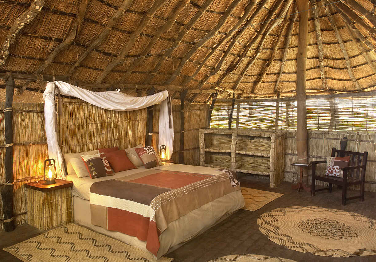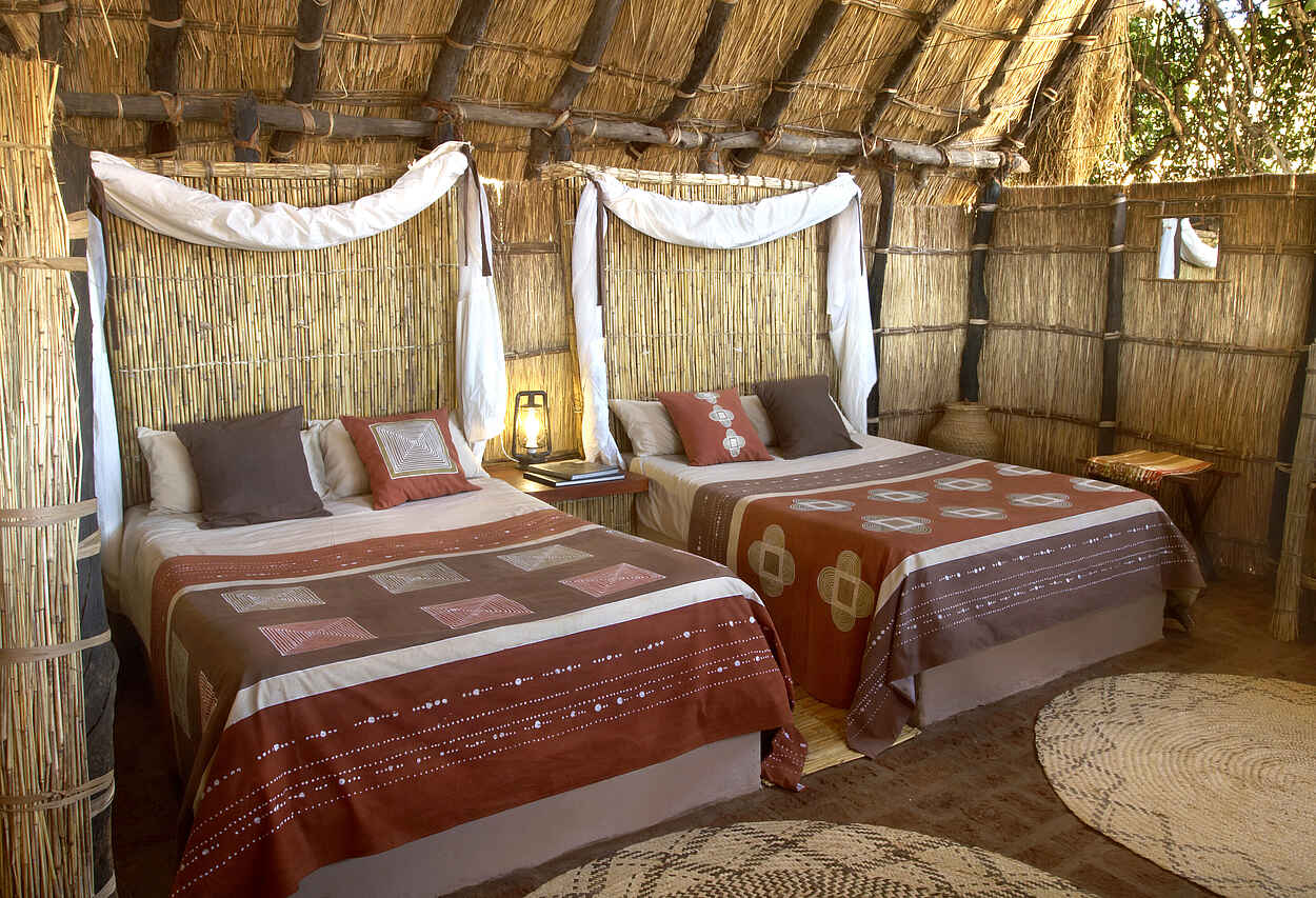 6 komfortable und geräumige schilfgedeckte Chalets, davon 4 identisch mit je 2 Doppelbetten, eine Honeymoon Suite mit King-Size-Bett und eine größere Suite mit 2 benachbarten Schlafräumen, je nach Bedarf z. B. für kleine Familien. Alle Räume mit nach oben offenem Badezimmer, Heißwasser-Dusche und WC mit Spülung, die Honeymoon Suite verfügt über eine Doppeldusche für Paare. 24h Elektrizität.