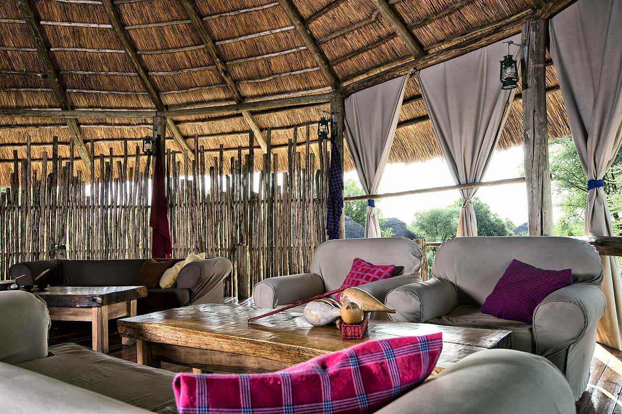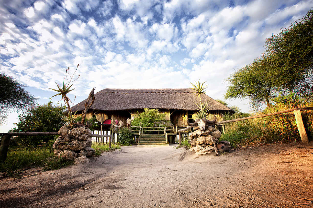Die reetbedeckte Hauptlodge ist auf hölzernen Stelzen erbaut und bietet einen Speisesaal mit Innen- und Außenbereich sowie eine Lounge und eine große Veranda mit Feuerstelle und umgebender Sitzgruppe. Außerdem einen Swimmingpool mit Liegestühlen.