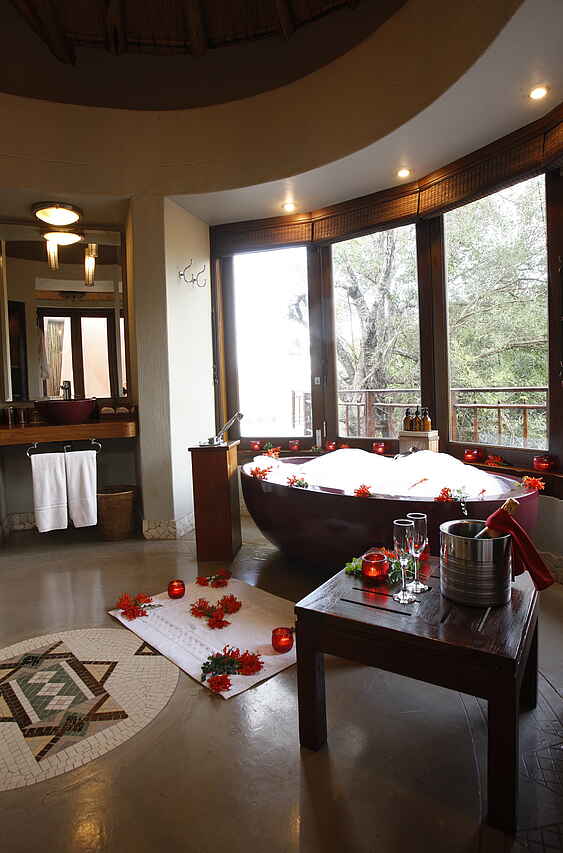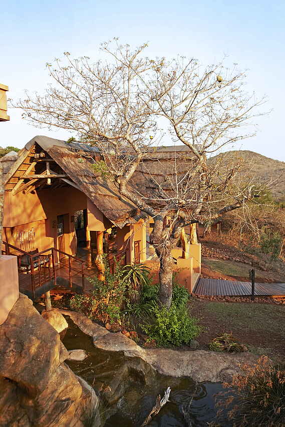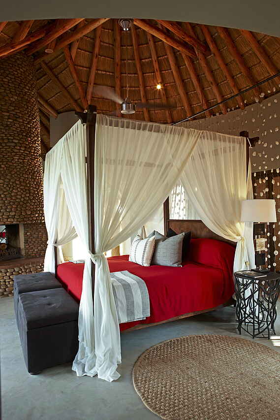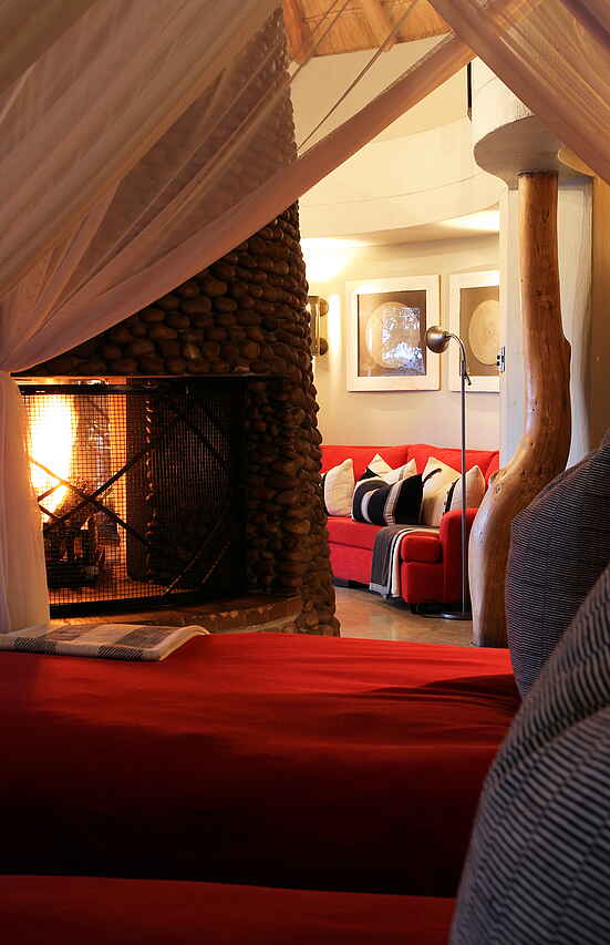 9 einzelstehende Chalets als Twin oder Double in typischer Rondavelbauweise, max. 2 Erwachsene und 2 Kinder Chalet; mit Rieddach, rot-brauner Anstrich. Stil und Einrichtung an lokalem Zulukolorit orientiert. Jede Suite 220 m² ! Mit privater Holzterrasse, Plungepool, Schlafzimmer und Lounge mit Kamin. Im Classic Safari Tent stehen im en-suite Badezimmer eine Innendusche sowie ein Waschbecken zur Verfügung. Das Luxury Safari Tent ist mit einer Badewanne oder Innendusche ausgestattet sowie standardmäßig mit Innen- und Außenduschen und zwei Waschbecken. Das Jabula Tent verfügt neben einer Badewanne, zwei Waschbecken und einer Außendusche zusätzlich über einen beheizten Pool. Deckenventilator, Air Condition, Moskitonetze, Minibar, Minisafe, Fön und Wäscheservice; Strom mit 220V und WiFi vorhanden.