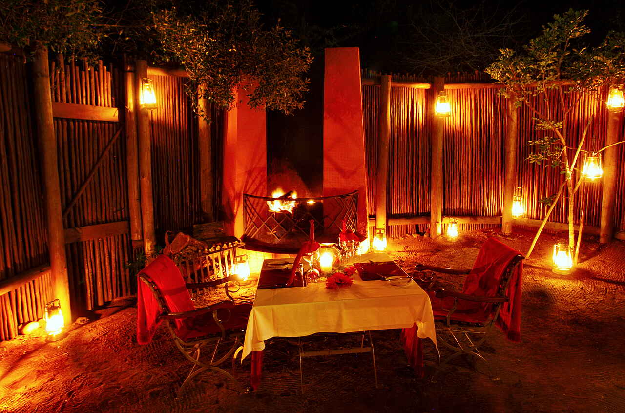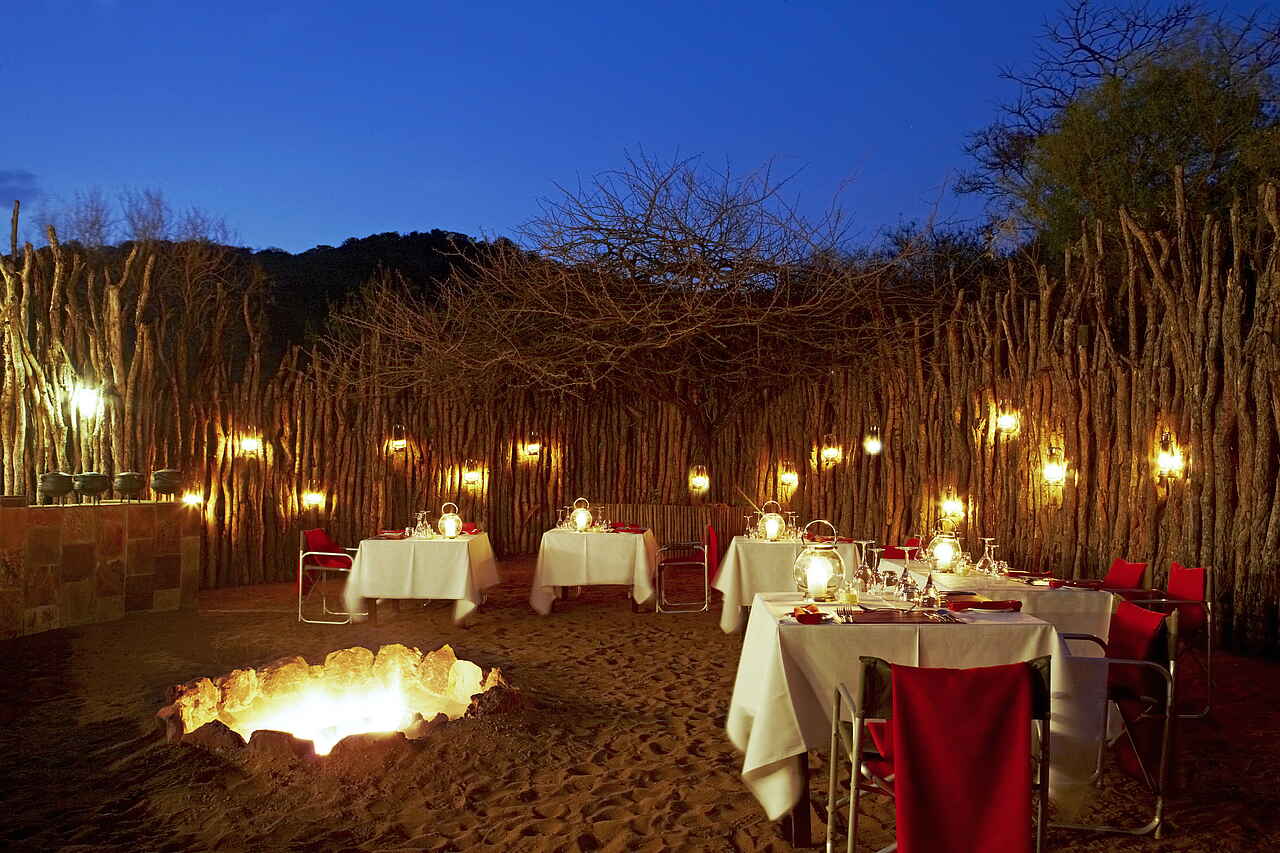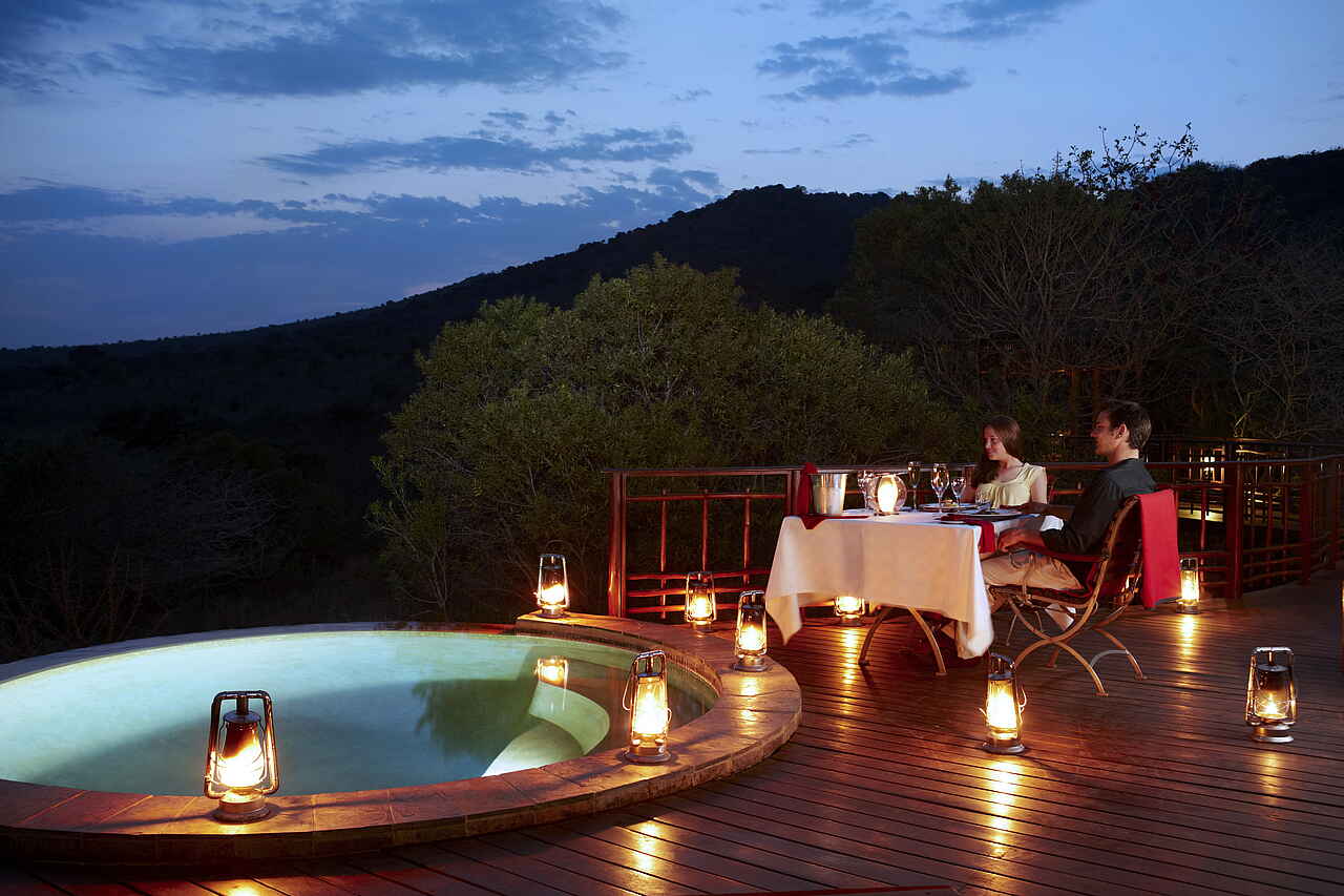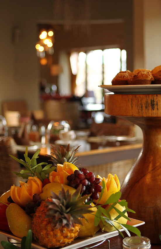 3 Hauptmahlzeiten pro Tag, dazu Snacks und Sundowner vor und während den Aktivitäten. Hauptmahlzeiten gemeinsam in der Boma oder am Einzeltisch im Speisesaal und auf der Terrasse. Private Dinner auf Anfrage und gegen Zusatzkosten. Westliche und Zulu Küche; Weinkarte.