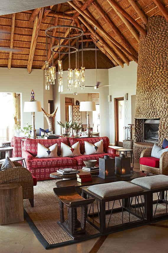 Große riedgedeckte Hauptlodge auf Holzpodest, mit geräumiger, heller Lounge mit Bar, Restaurant mit Terrasse nebst Weinkeller, Boma, Bibliothek mit Blick auf ein Wasserloch; Spabereich. Strom mit 220V und WiFi vorhanden, eingeschränkter Handyempfang.