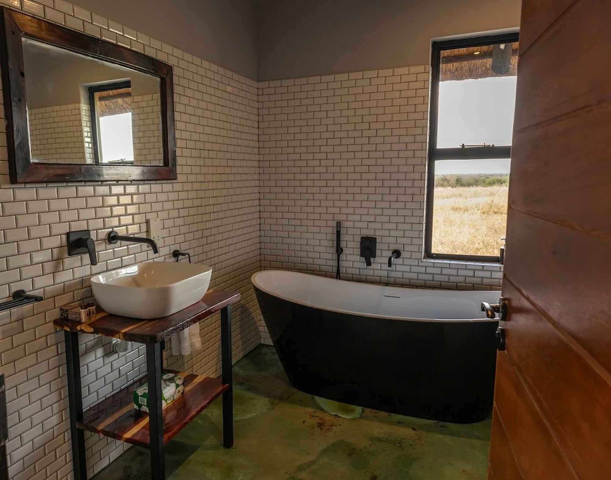 Der großzügige Hauptbereich des Camps mit Lounge, Bar und Essbereich öffnet sich weit zur umliegenden Landschaft. Bequeme Sitzgelegenheiten, natürliche Materialien und große Fenster schaffen eine offene, ruhige Atmosphäre mit freiem Blick auf das Wasserloch. Ein Pool bietet Erfrischung in den warmen Stunden des Tages, während am Abend der Lagerfeuerplatz zum gemeinsamen Ausklang unter freiem Himmel einlädt. Rund um das Camp verteilen sich gut platzierte Beobachtungshütten, die ungestörte Tierbeobachtungen in aller Stille ermöglichen. Die Gestaltung ist bewusst unaufdringlich und lässt die Weite der Kalahari wirken. WLAN ist kostenfrei im Hauptbereich verfügbar.