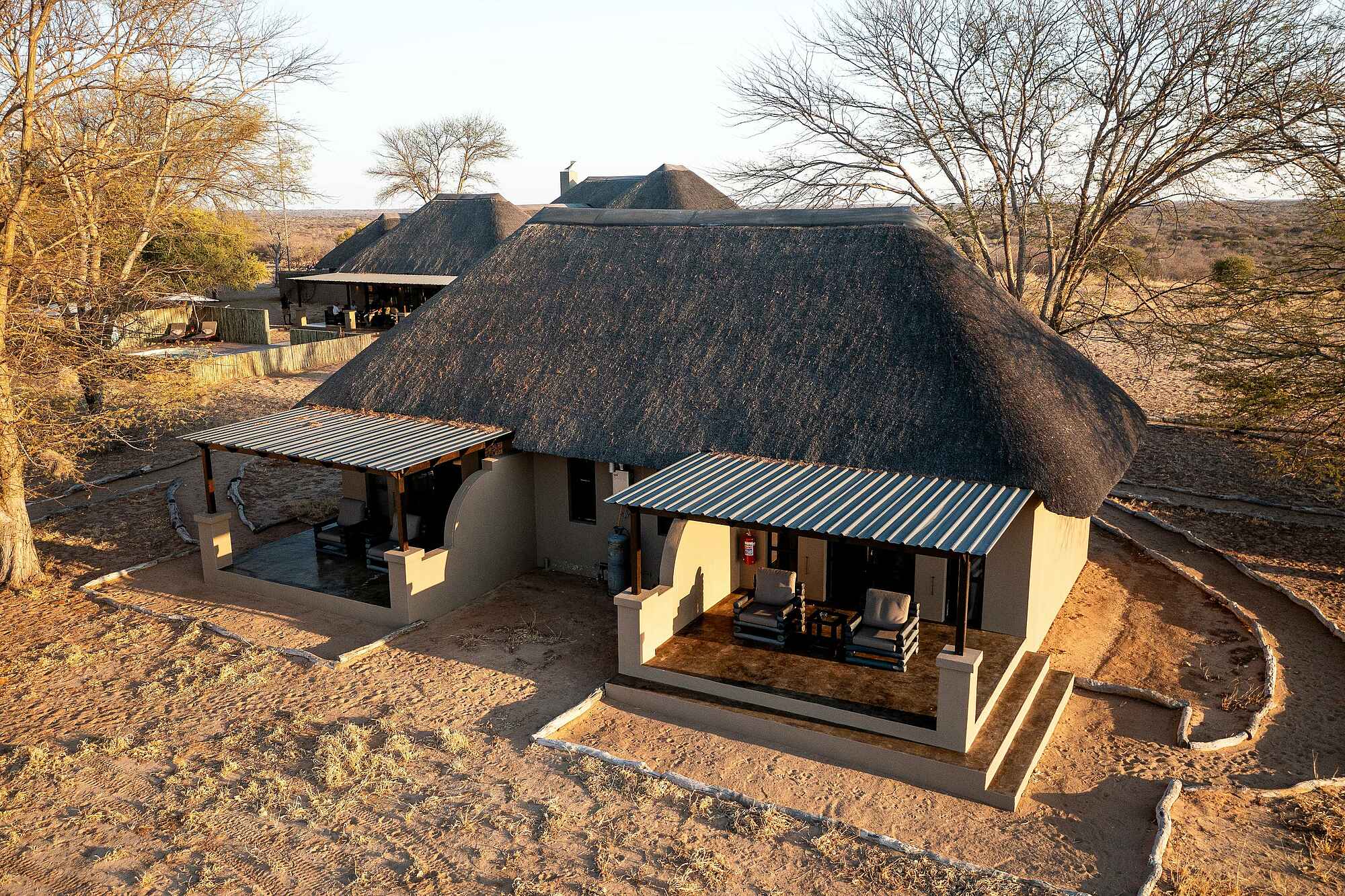 Die acht Chalets des Camps stehen auf erhöhten Holzplattformen und bieten einen freien Blick auf die Kalahari. Jedes Chalet verfügt über ein großzügiges Schlafzimmer mit Doppel- oder Twinbetten, Moskitonetz, Ventilator, Sitzbereich und ausreichend Stauraum. Die private Veranda lädt zum Beobachten der Umgebung ein. Das En-suite-Badezimmer ist mit freistehender Badewanne, Dusche, WC und Waschbecken ausgestattet. Handtücher, Pflegeprodukte und bei Bedarf ein Haartrockner sind vorhanden.