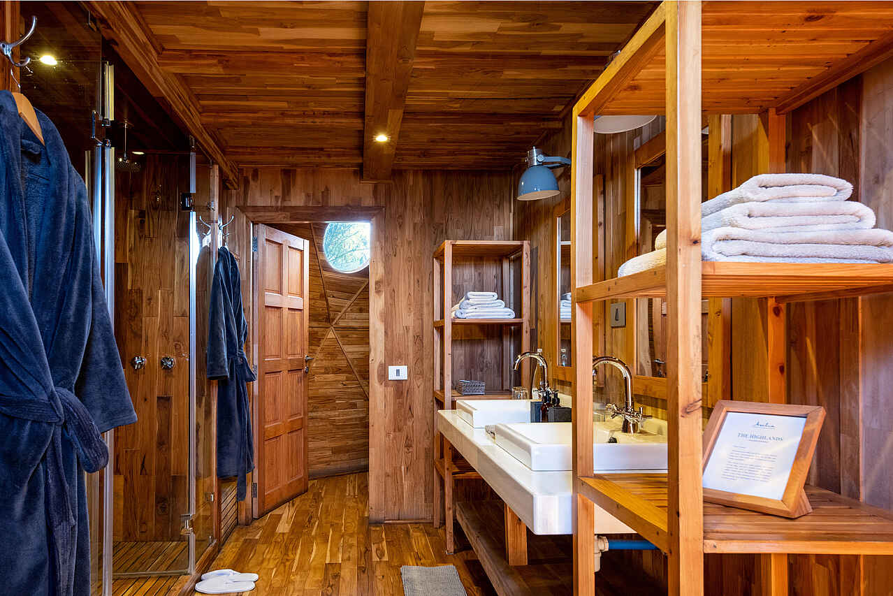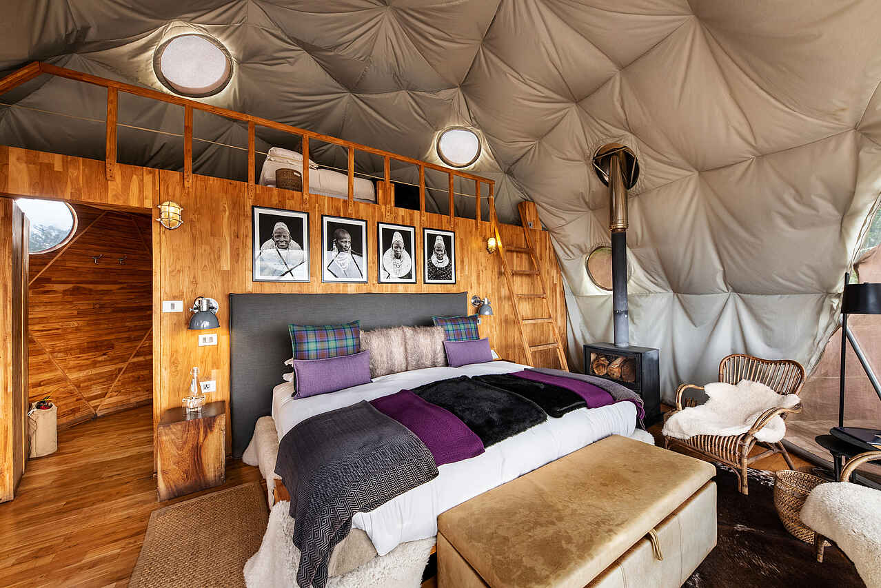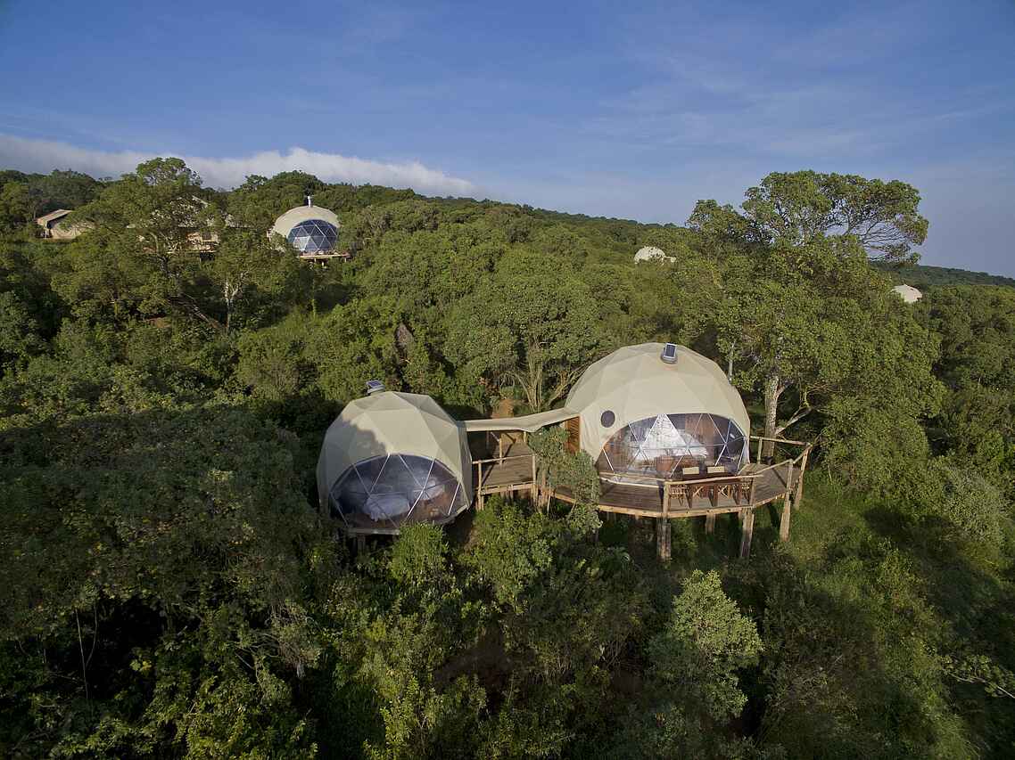 Die acht Dome-Suiten sind das Markenzeichen von The Highlands Camp und verbinden stilvolle Einrichtung mit Ruhe und Komfort in höherer Lage. Die Rundform schafft ein großzügiges Raumgefühl, während die geschwungenen Fensterfronten viel Tageslicht einlassen und den Blick in die umliegenden Wälder öffnen. Jede Suite verfügt über ein großes Bett, eine gemütliche Sitzecke, einen kleinen Holzofen für die kühlen Abende und eine private Terrasse. Minibar, Trinkwasser sowie Kaffee- und Teezubereitungsmöglichkeiten gehören zur Ausstattung. Das En-suite-Badezimmer bietet eine Doppeldusche, Spültoilette, Doppelwaschbecken, Pflegeprodukte und Handtücher. Die Honeymoon-Suite verfügt zusätzlich über eine Hot Tub im Außenbereich. Eine Familiensuite mit zwei Schlafzimmern und privatem Wohnbereich ergänzt das Angebot.