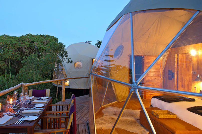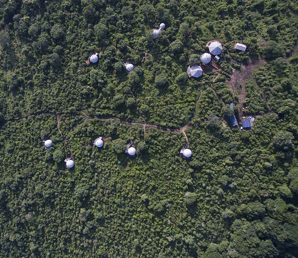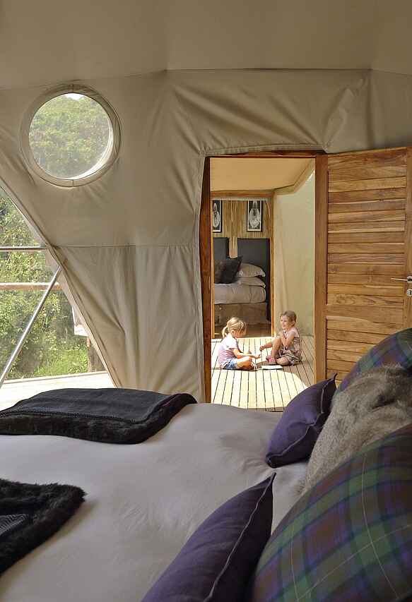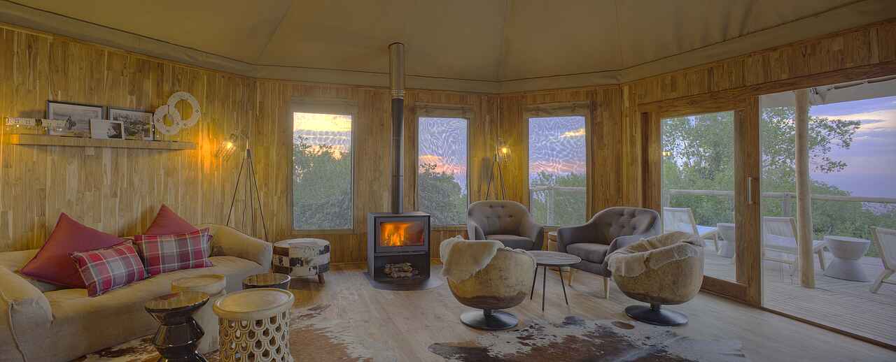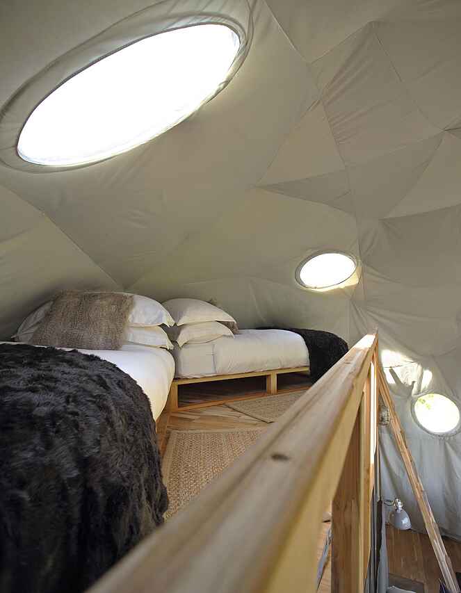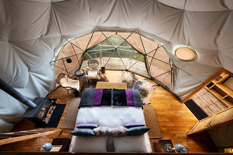 Die acht Dome-Suiten sind das Markenzeichen von The Highlands Camp und verbinden stilvolle Einrichtung mit Ruhe und Komfort in höherer Lage. Die Rundform schafft ein großzügiges Raumgefühl, während die geschwungenen Fensterfronten viel Tageslicht einlassen und den Blick in die umliegenden Wälder öffnen. Jede Suite verfügt über ein großes Bett, eine gemütliche Sitzecke, einen kleinen Holzofen für die kühlen Abende und eine private Terrasse. Minibar, Trinkwasser sowie Kaffee- und Teezubereitungsmöglichkeiten gehören zur Ausstattung. Das En-suite-Badezimmer bietet eine Doppeldusche, Spültoilette, Doppelwaschbecken, Pflegeprodukte und Handtücher. Die Honeymoon-Suite verfügt zusätzlich über eine Hot Tub im Außenbereich. Eine Familiensuite mit zwei Schlafzimmern und privatem Wohnbereich ergänzt das Angebot.