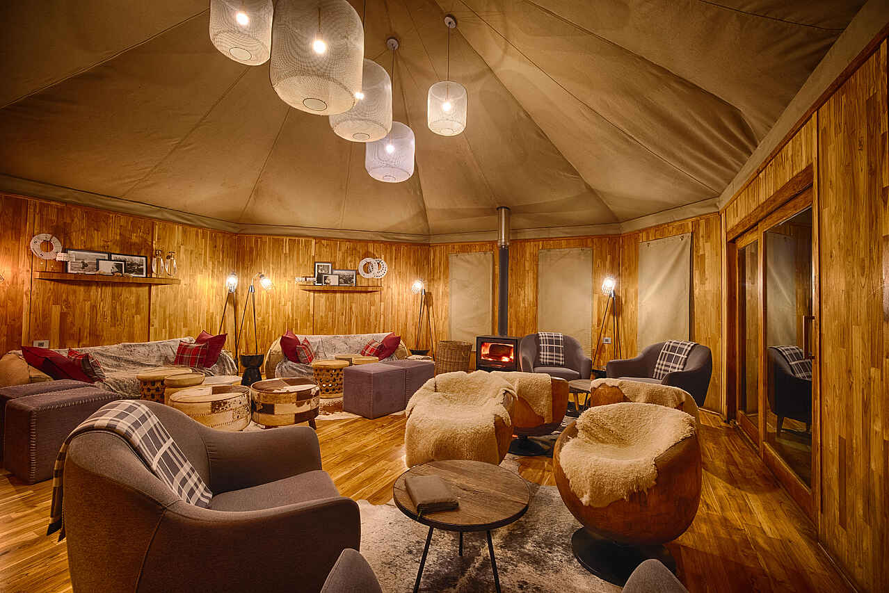 Die zentralen Bereiche von The Highlands Camp befinden sich in modernen Kuppelstrukturen, die viel Licht einlassen und den Blick über den Wald und die Hänge des Olmoti-Vulkans öffnen. Die Lounge bietet bequeme Sofas, Sessel und einen zentralen Kamin, der in den kühlen Abendstunden für Wärme sorgt. Der offene Essbereich ist einladend gestaltet und ermöglicht gemeinsames Speisen in ruhiger Atmosphäre. Eine gut sortierte Bar serviert lokale Weine und ausgewählte Spirituosen. Ergänzend stehen ein kleines Spa und eine Sauna zur Verfügung, die nach Wanderungen oder Kraterausflügen spürbare Erholung bieten. Am Abend bildet die Boma den Mittelpunkt des Camps, wo Gäste am Feuer sitzen und die klare Bergluft genießen. Die Kombination aus Naturmaterialien und modernen Akzenten schafft ein ruhiges, hochwertiges Umfeld für den Aufenthalt.