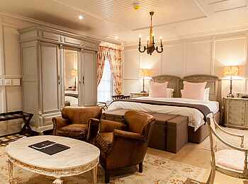 Die Atmosphäre im gesamten Hotel ist geprägt von einer Kombination aus Großzügigkeit und Eleganz, was sich in den antiken Kunstwerken und den opulenten Holzmöbeln widerspiegelt. In der Bibliothek finden Gäste eine ruhige, gemütliche Ecke zum Lesen. Das Spa des Hotels, ausgestattet mit sieben Behandlungsräumen, einer Sauna, einem Dampfbad und einem beheizten Indoorpool, bietet vielfältige Entspannungsmöglichkeiten.