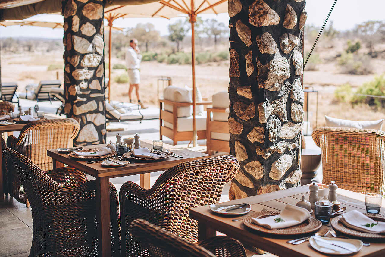 Das Herzstück der Lodge bilden zwei stilvolle Lounge-Bereiche mit hohen Decken, Kamin und gemütlichen Sitzmöglichkeiten, in denen modernes Design und afrikanische Akzente harmonisch zusammenfinden. Ergänzt werden sie durch eine kleine Bibliothek, die zum Schmökern und Verweilen einlädt. Auf der Terrasse öffnet sich der Blick auf den Klaserie-Fluss, wo sich oft Wildtiere versammeln. Ein Infinity-Pool sorgt für Erfrischung, während in der traditionellen Boma die Abende bei Feuer, gutem Essen und Sternenhimmel ausklingen. Unter alten Bäumen laden schattige Plätze zum Entspannen ein. Ein kleiner Barbereich und liebevoll gestaltete Essplätze innen wie außen runden die Gemeinschaftsbereiche ab.