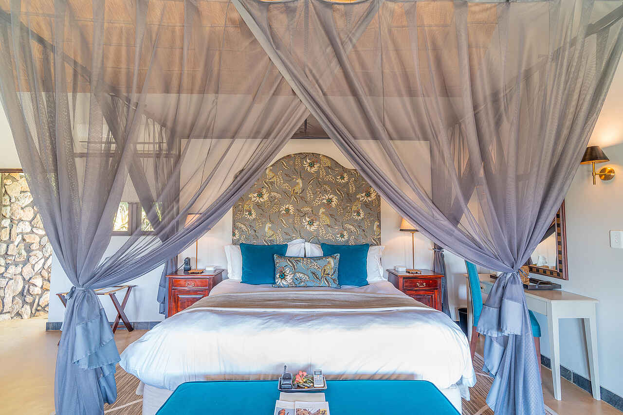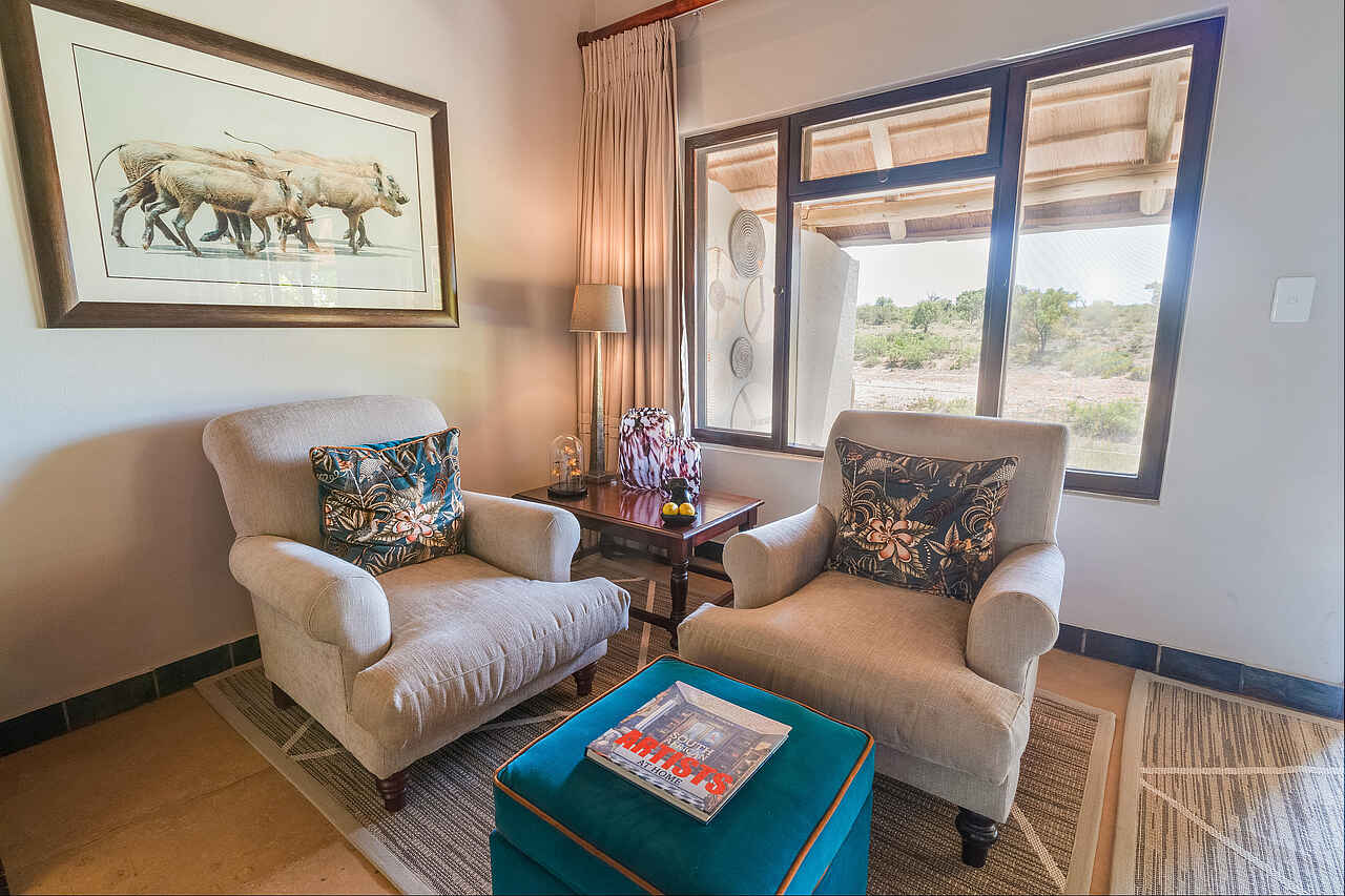 Die sechs Luxury Suiten sind großzügig gestaltet und geschmackvoll eingerichtet. Helle Farben, Naturstoffe und afrikanische Details sorgen für ein entspanntes Ambiente. Jede Suite verfügt über ein King-Size-Bett mit Moskitonetz, eine Sitzecke, Minibar, Kaffee- und Teezubereitung, Safe, WLAN sowie Bademäntel und Slipper. Die En-suite-Badezimmer bieten eine freistehende Badewanne, eine Indoor- und eine Outdoor-Dusche, Doppelwaschbecken, Haartrockner und weiche Handtücher. Von der privaten Terrasse blickt man direkt auf den Klaserie-Fluss und die vorbeiziehende Wildnis. Für Familien können zusätzliche Betten bereitgestellt werden.
